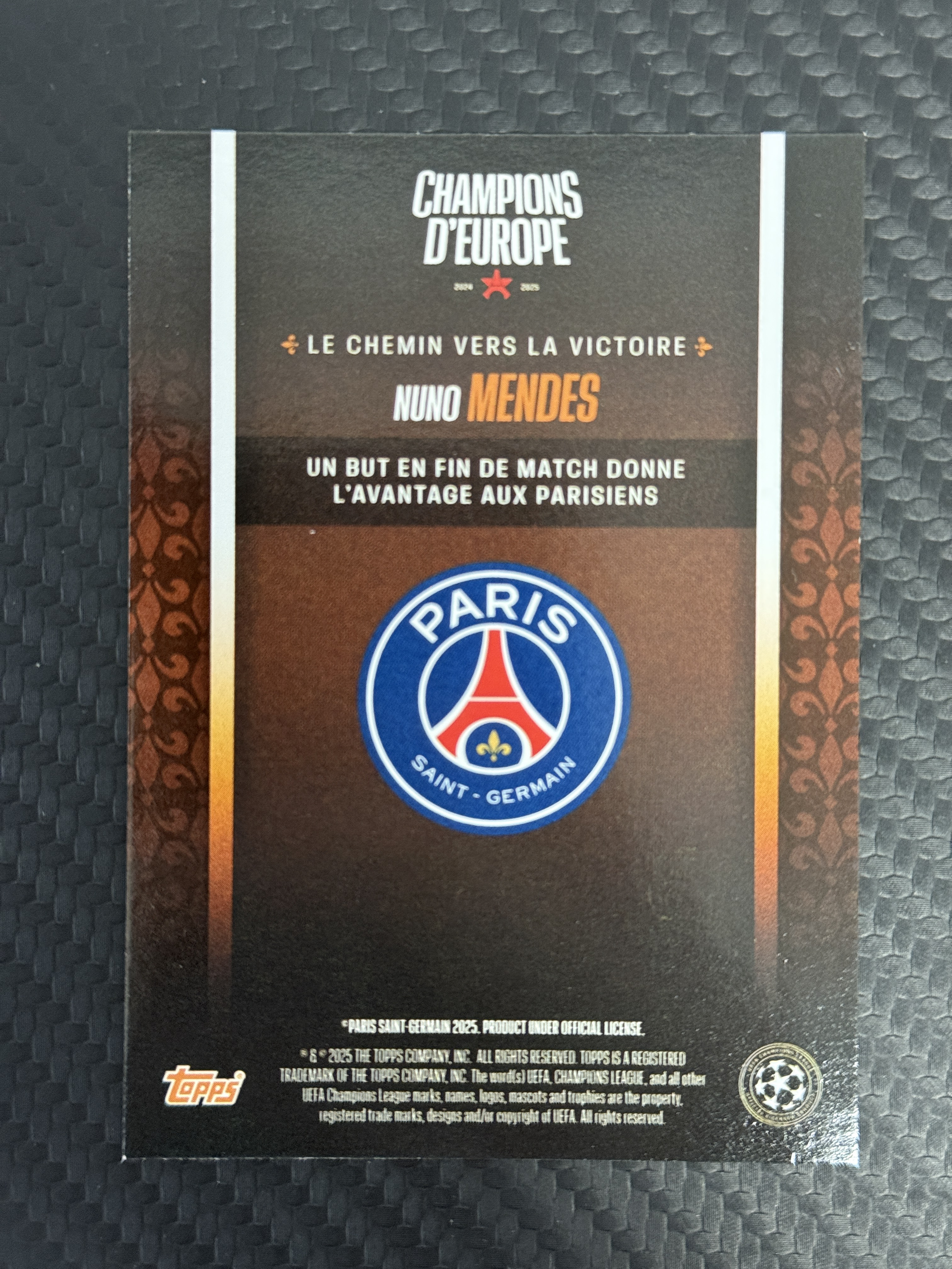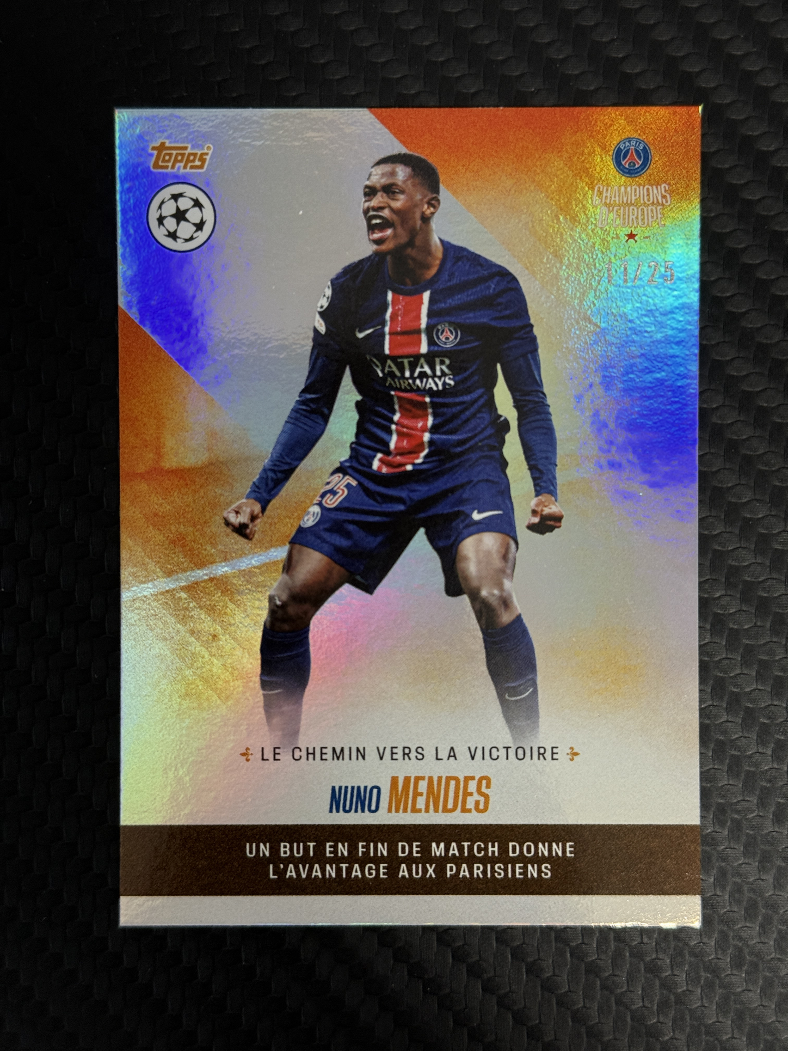 2025 Topps PSG Champions D'Europe Nuno Mendes 【包来拍卖】巴黎冠军队盒 葡萄牙 努诺 门德斯 胜利之路 11/25编 橙折 卡品如图 胡子