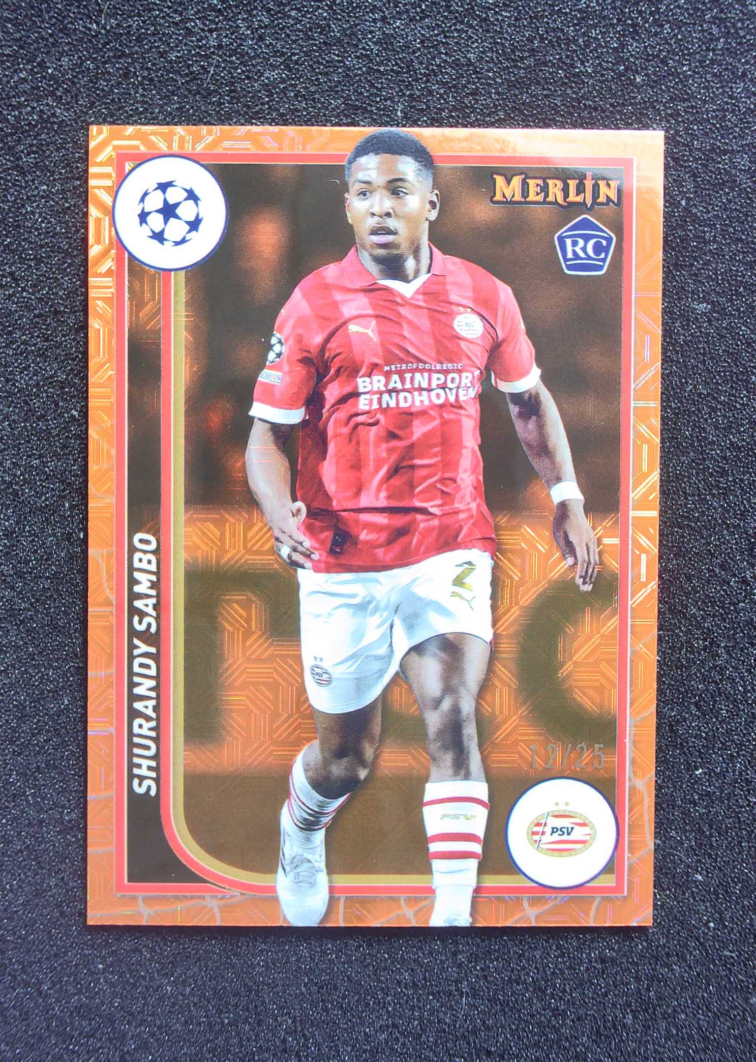 (代拍力 0手续费接代卖 当天满1000元包邮)2023-24 Topps Merlin 梅林系列 基础卡 新秀 RC 埃因霍温 桑博 Shurandy Sambo 橙折 12/25编 LB01