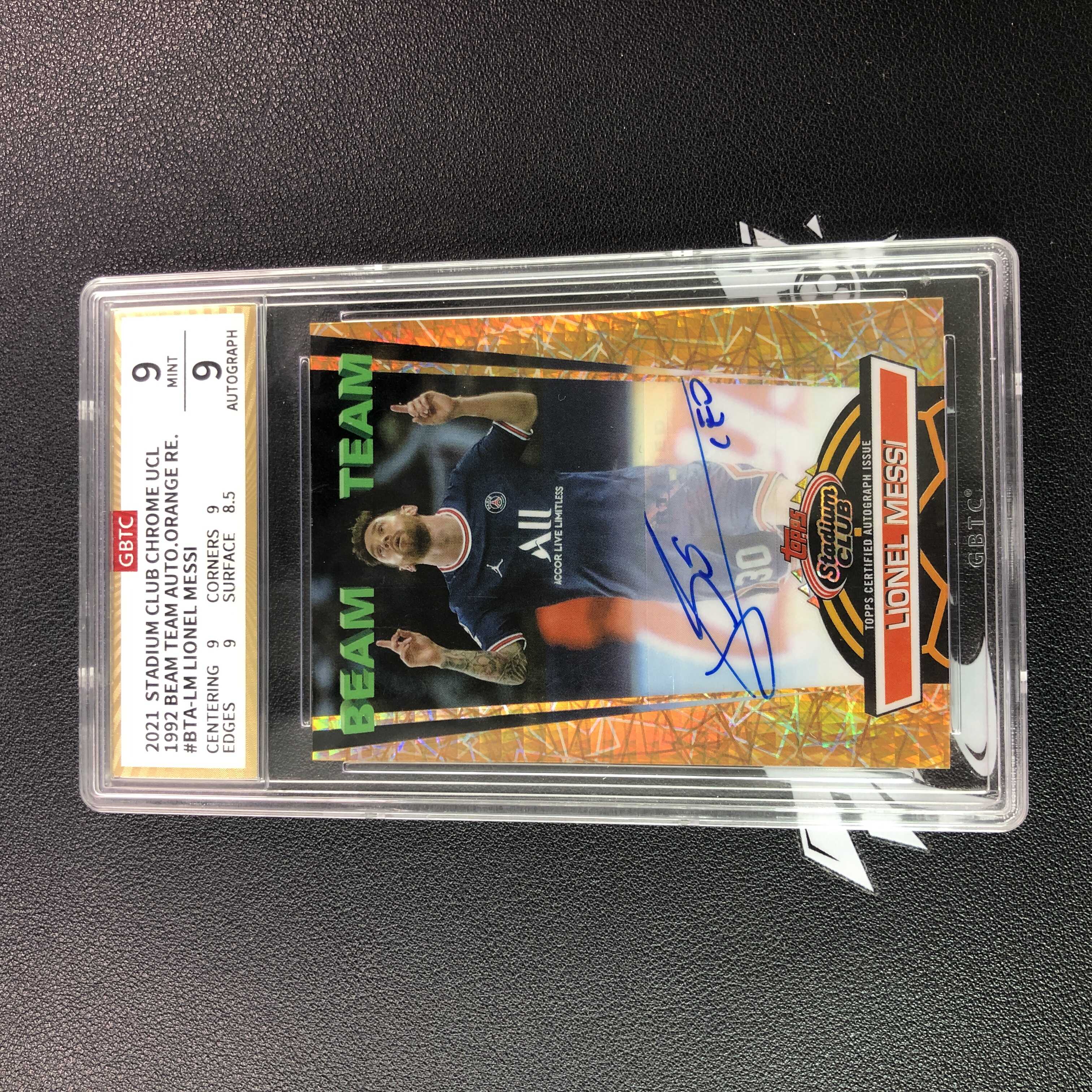 【怒射拍卖 接代卖】拔脚朝辉N1 2021-22 Topps Stadium Club竞技场 GBTC双9 Lionel Messi 梅西 大巴黎 欧冠 签字 光之队特卡 球王 7/25编 橙折