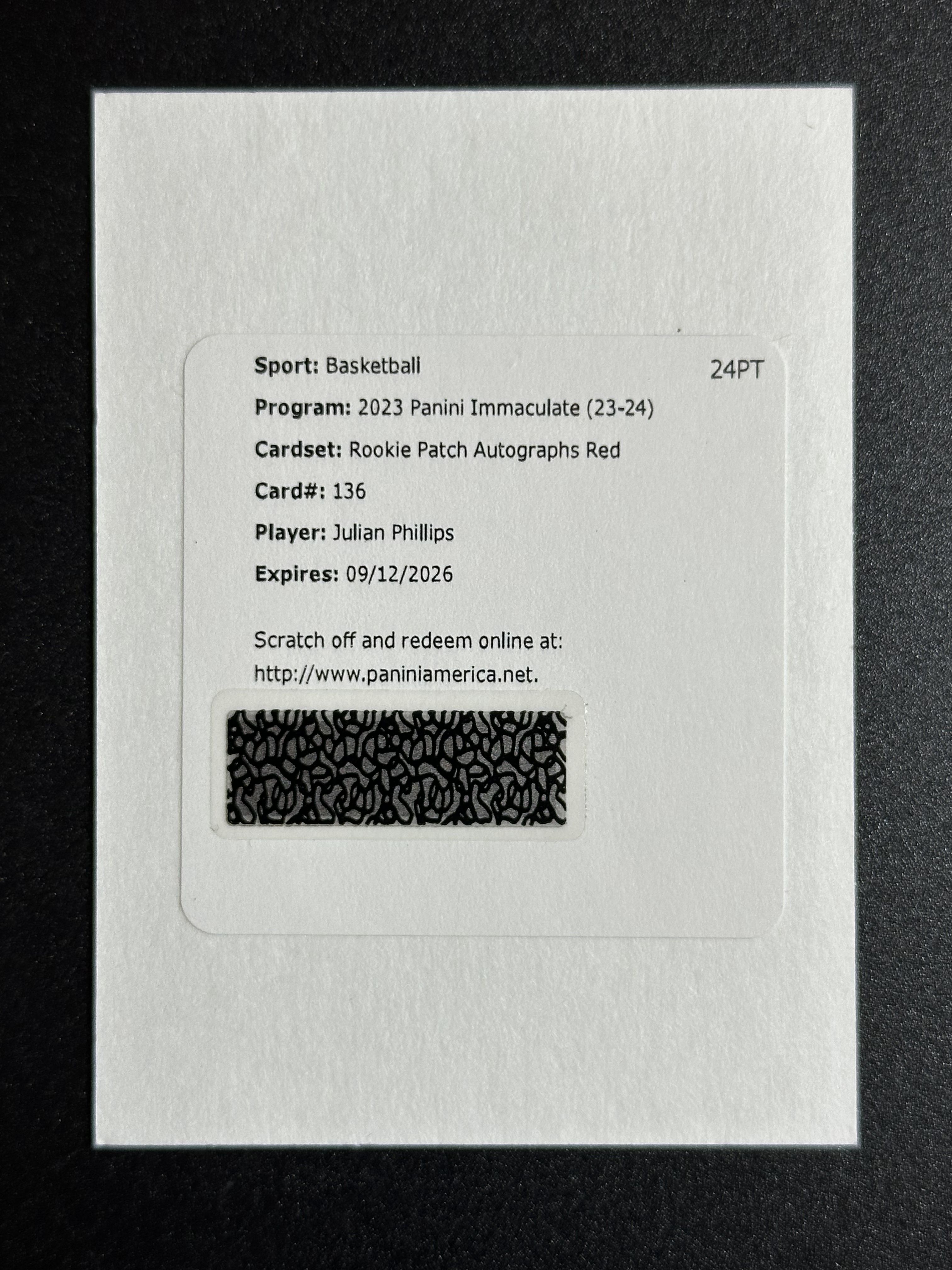 【口袋卡牌】2023-24 Panini Immaculate Julian Phillips RC 公牛 新秀 菲利普斯 49编 签字 签名 Patch 球衣 交换板 -JH