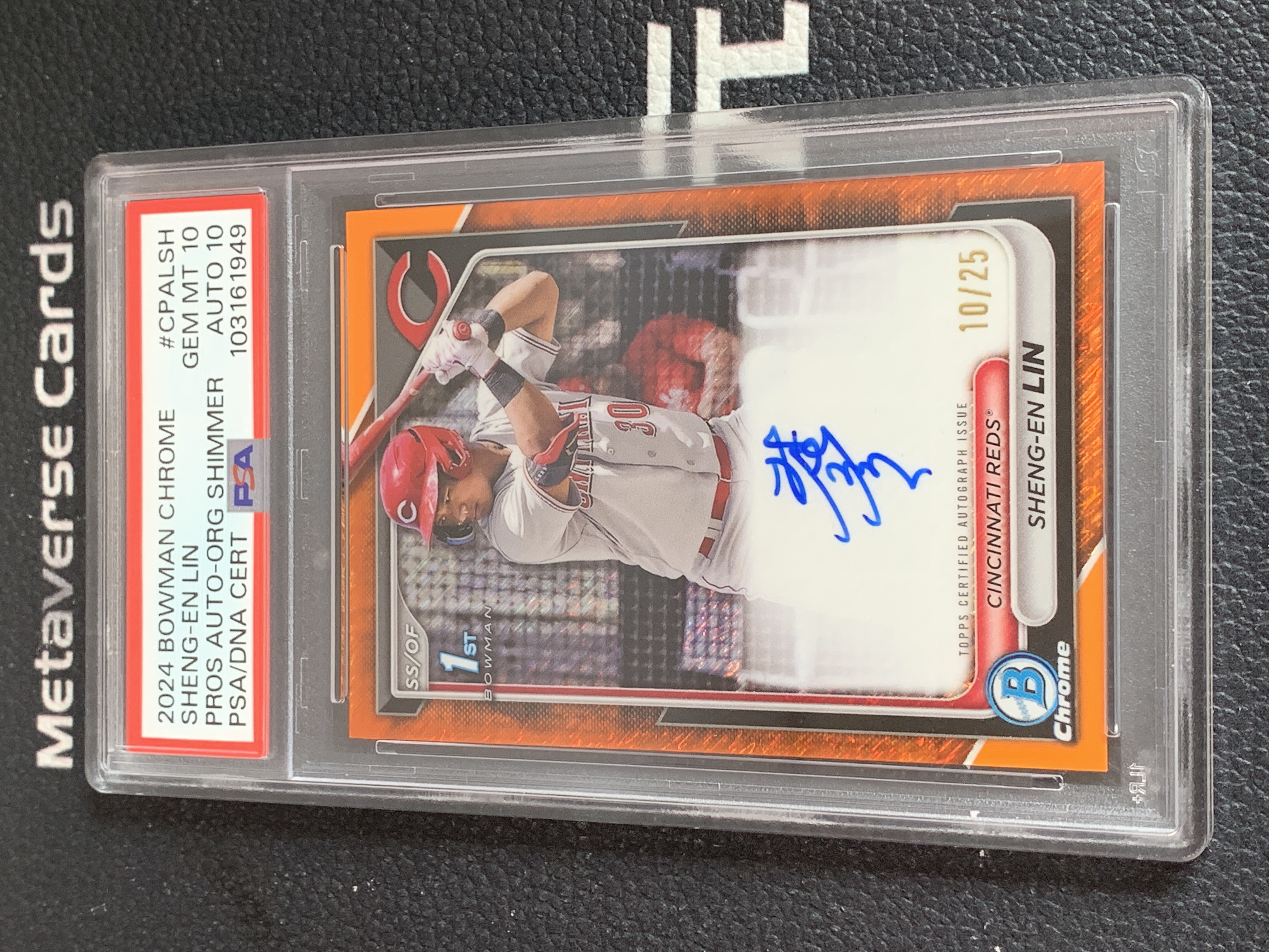 【元宇宙拍卖】可马017:2020 Topps Bowman Chrome Sheng-En Lin 棒球 林圣恩 辛辛那提红人队 1st 新秀RC 10/25编 橙shimmer折 折射 签字 签名 卡签 PSA双10 品墨完美 POP2