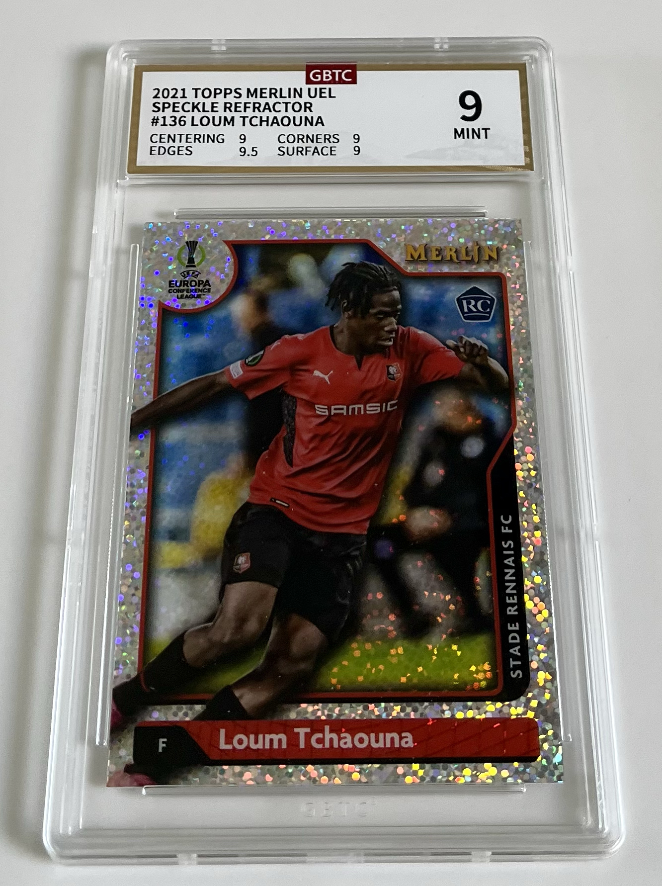 【小仙拍卖】WG 2021-22 Topps Merlin梅林系列 欧冠 雷恩 新秀 RC 沙乌纳 Loum Tchaouna 斑点折 Base 限量/150编 公博评级9分!专收升值必备