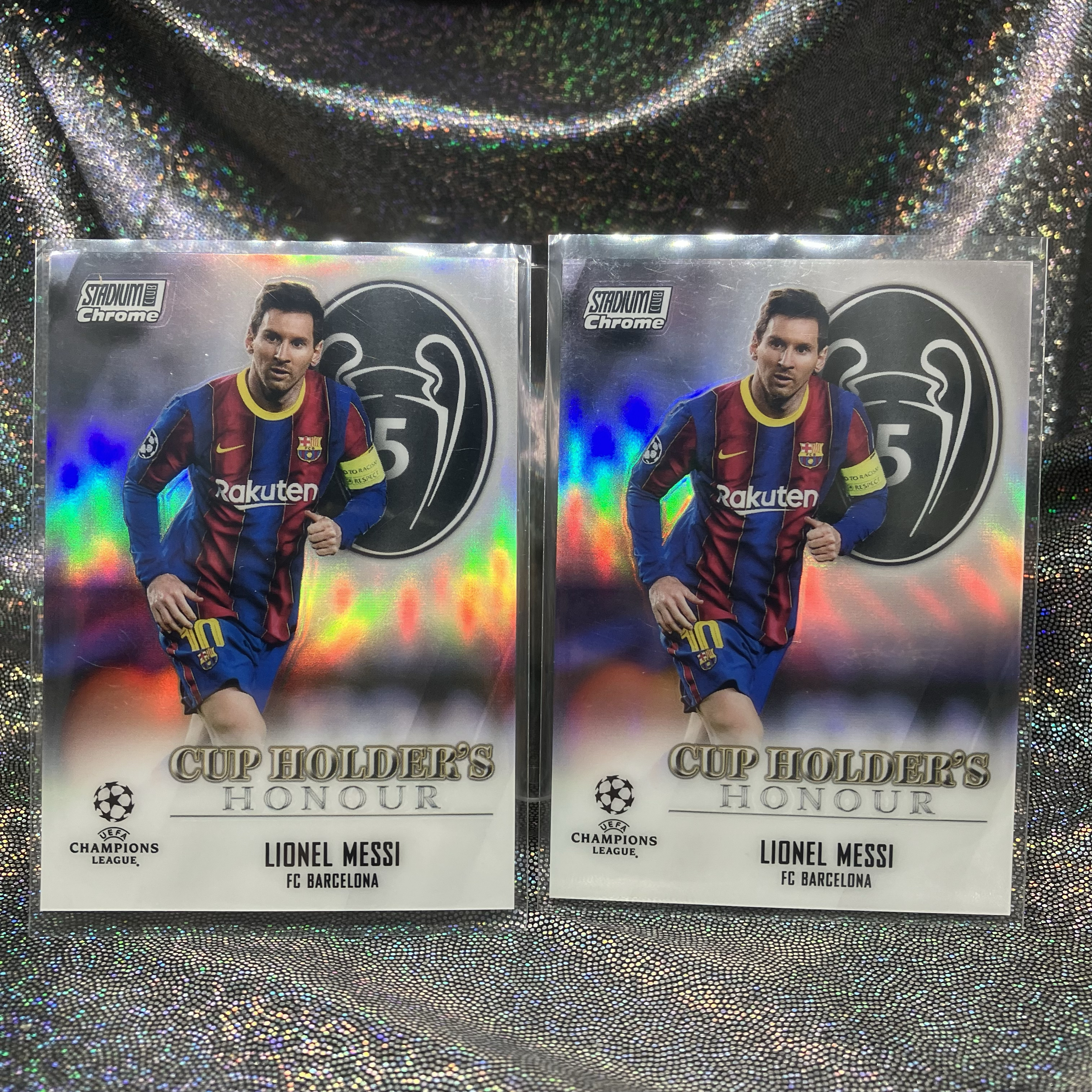 2020-21 Topps Stadium Club Chrome Lionel Messi 竞技场 梅西 煤老板 银折 冠军荣耀 特卡 2张打包 5欧冠数据 巴萨 巴塞罗那 折射 阿根廷球王