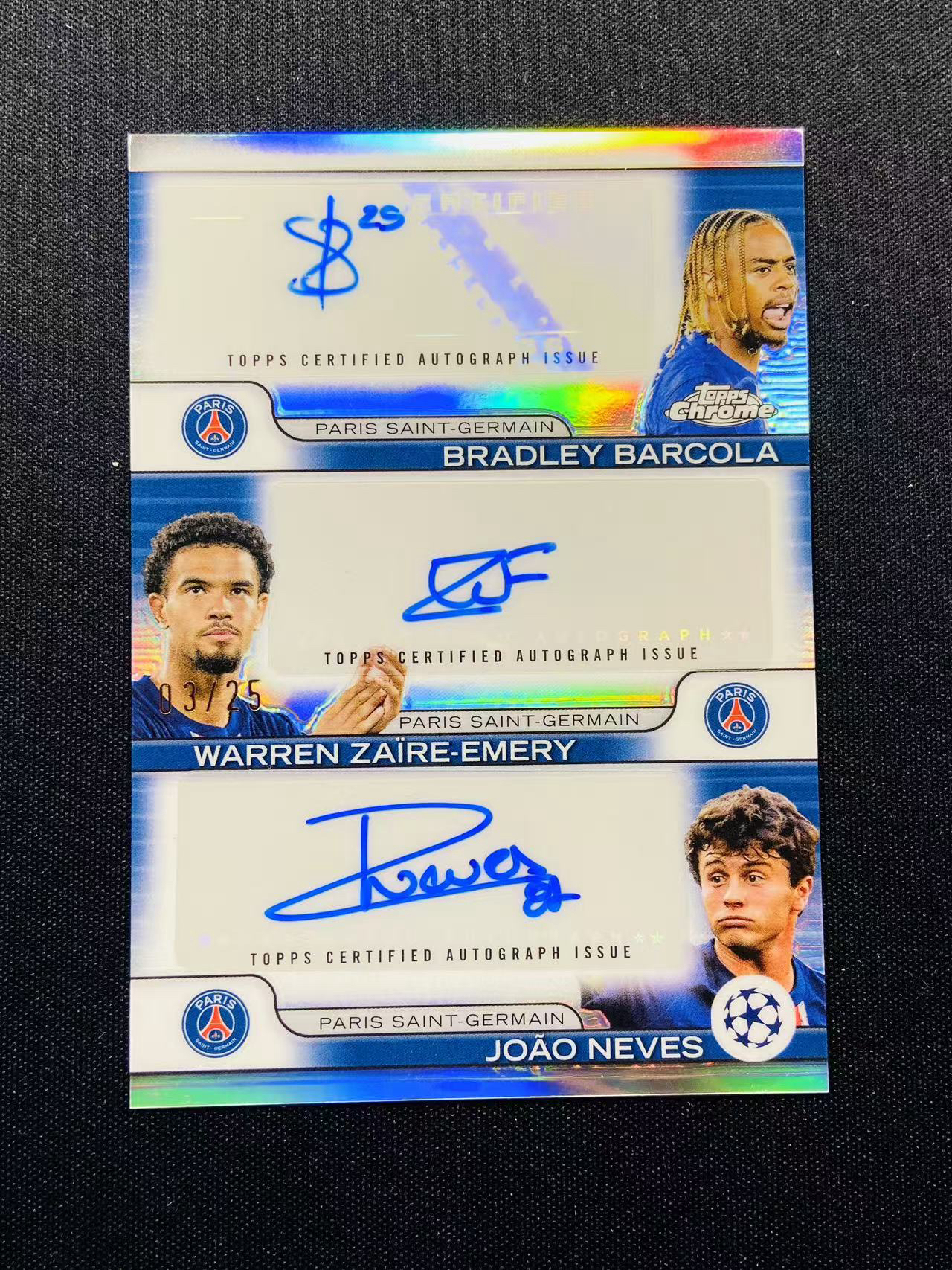 2024-25 Topps Chrome 欧战TC BARCOLA & ZAIRE-EMERY & NEVES 大巴黎 巴尔科拉埃梅里内维斯 三人签字 25编 微痕 洛北拍卖 HYyang1547