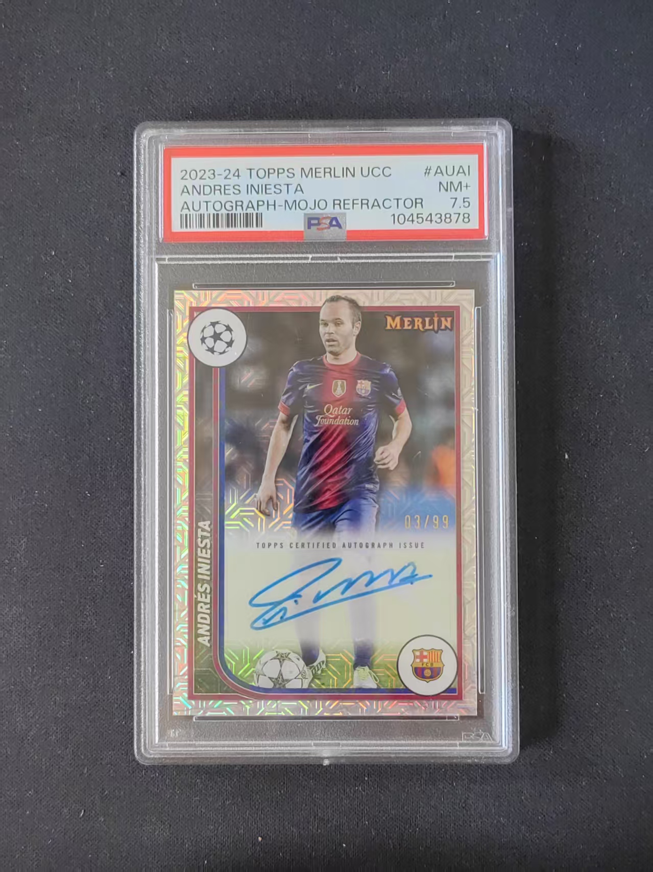 2024 Topps Merlin chrome Andres Iniesta 【阿泽拍卖宝宝巴士】PSA评级7.5分 梅林系列 欧冠 西甲 巴塞罗那 巴萨 伊涅斯塔 03/99编 签字 银迷宫折