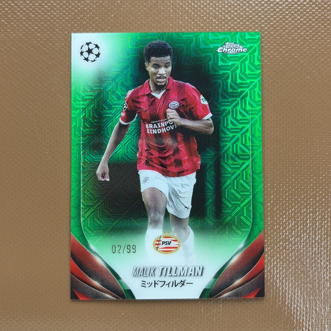 【佳佳代拍】2024 Topps Chrome 欧冠 日版 樱花 Malik Tillman 埃因霍温 蒂尔曼 02/99编 绿迷宫折 卡品如图 收藏必备(星月)