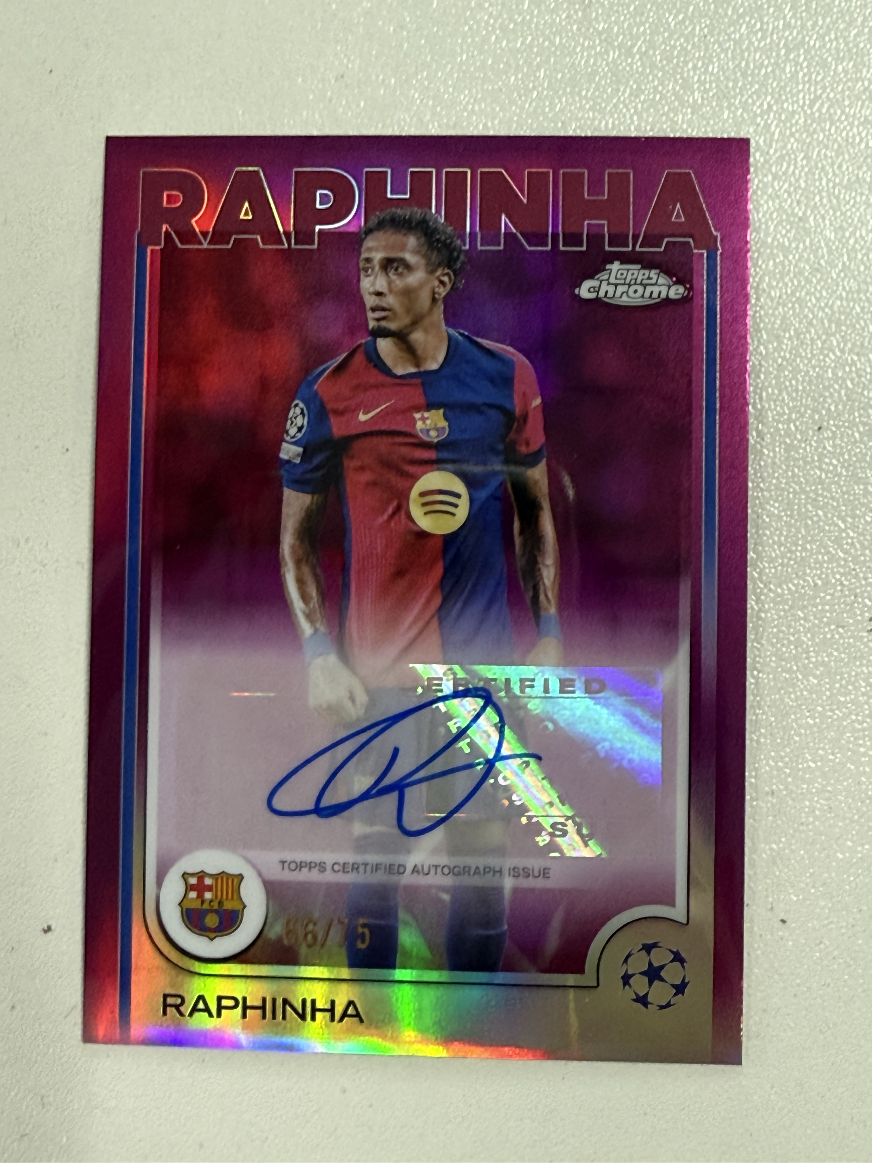 2024-25 Topps Chrome Raphinha Cu代卖甘 欧冠 欧战Tc 拉菲尼亚 巴塞罗那 巴萨 巴西 粉熔岩折 粉折 签字 base签 葡萄牙体育 /75编 折射 卡品如图