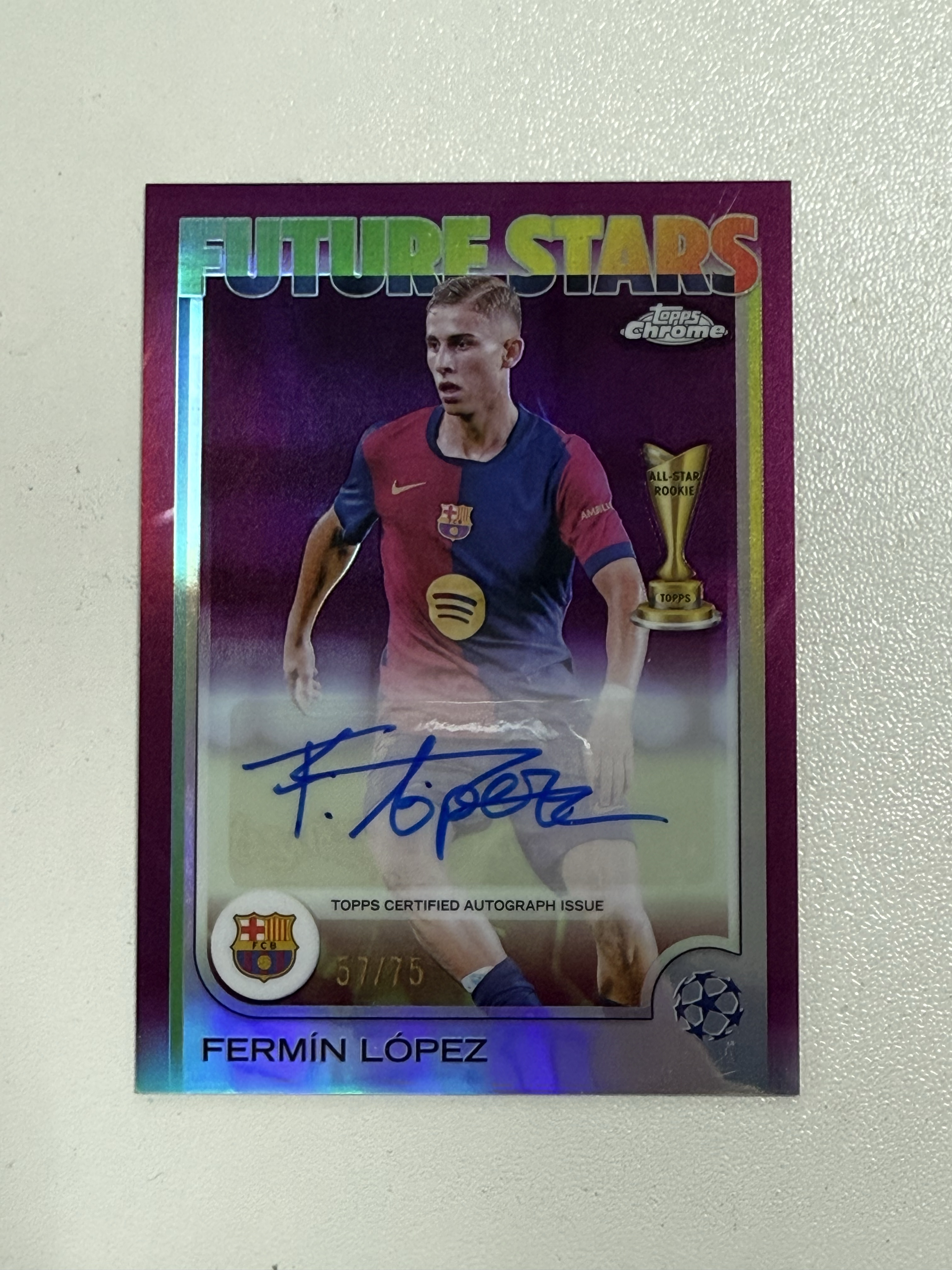2024-25 Topps Chrome Fermín López RC 欧战Tc 费尔明 洛佩斯 西班牙 新秀 未来之星签 签字 品红折 紫折 57/75编 对称编 巴萨 折射 卡品如图