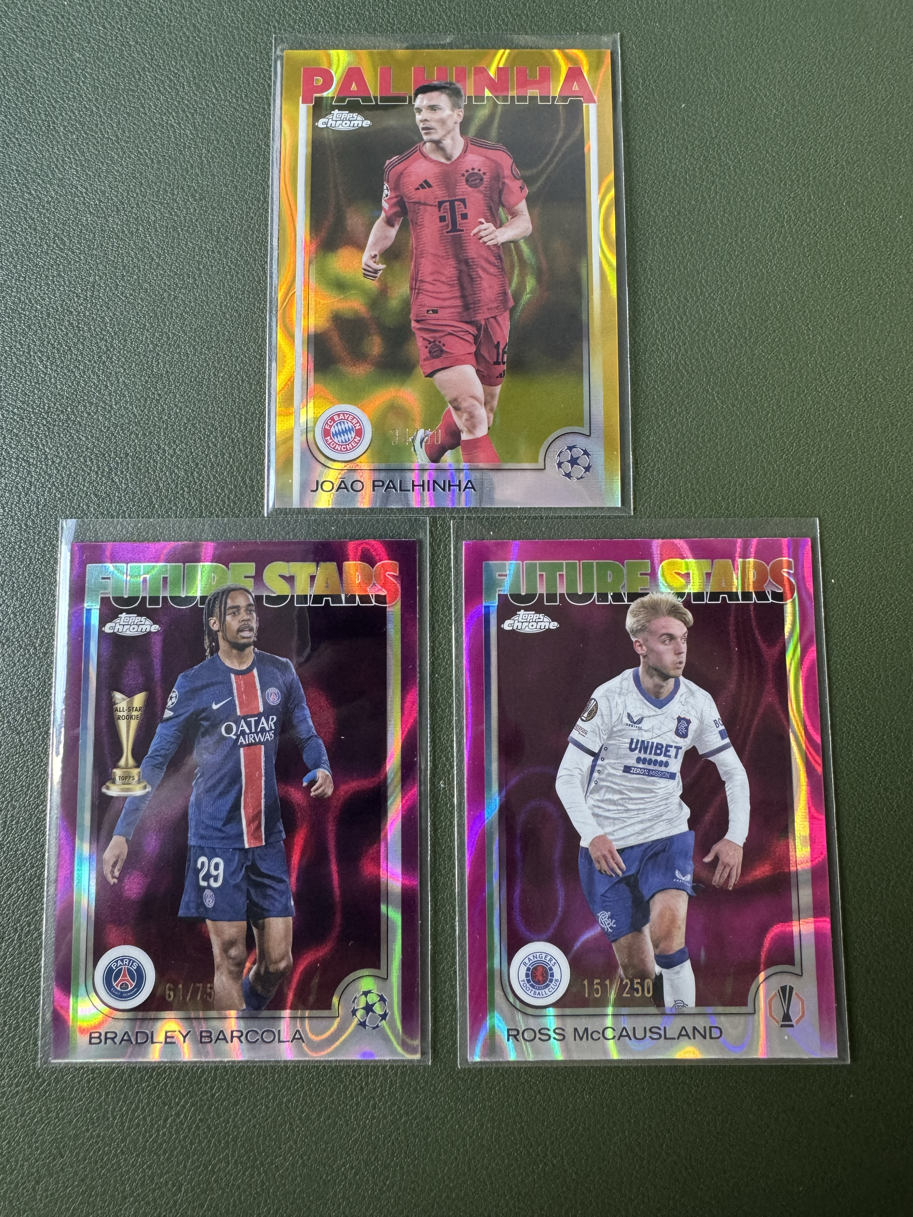 2025 Topps Chrome TC 大巴黎 巴尔科拉 新秀次年 紫熔岩 61/75编 流浪者 麦考斯兰 粉熔岩 151/250编 拜仁 帕里尼亚 金熔岩 34/50编