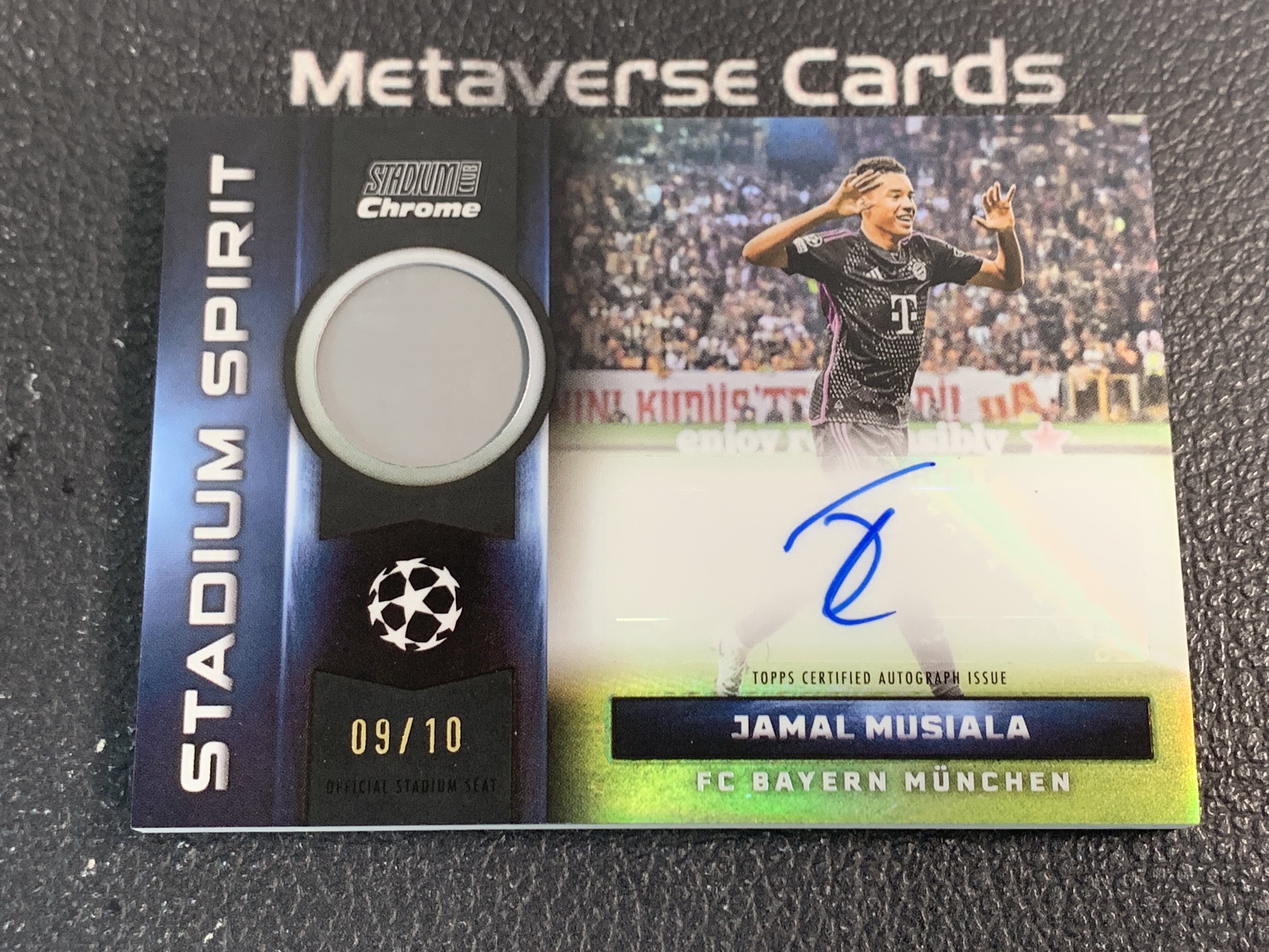 【元宇宙拍卖】J39-084:2023-24 Topps Stadium Club Chrome Jamal Musiala 拜仁 德国 穆西亚拉 穆夏拉 欧冠竞技场 低编 限量 黑折 折射 座椅 实物 签字 签名 09/10 微瑕如图