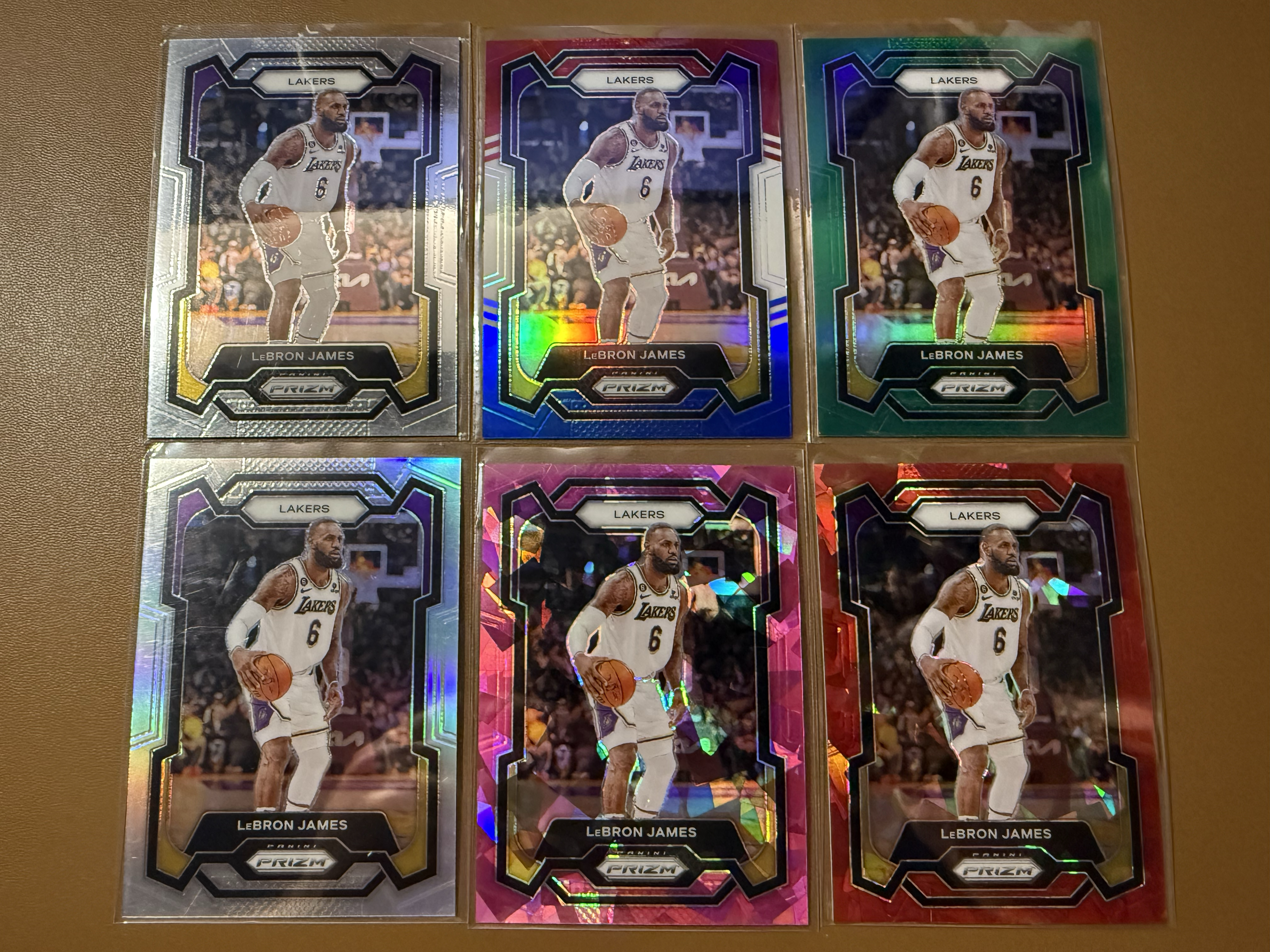 2023-24 Panini Prizm LeBron James Lot*6,勒布朗詹姆斯,03状元小皇帝,4万分先生,六张彩虹打包,普卡+三色折+银折+绿折+粉碎冰折+红碎冰折,折射效果超炫!
