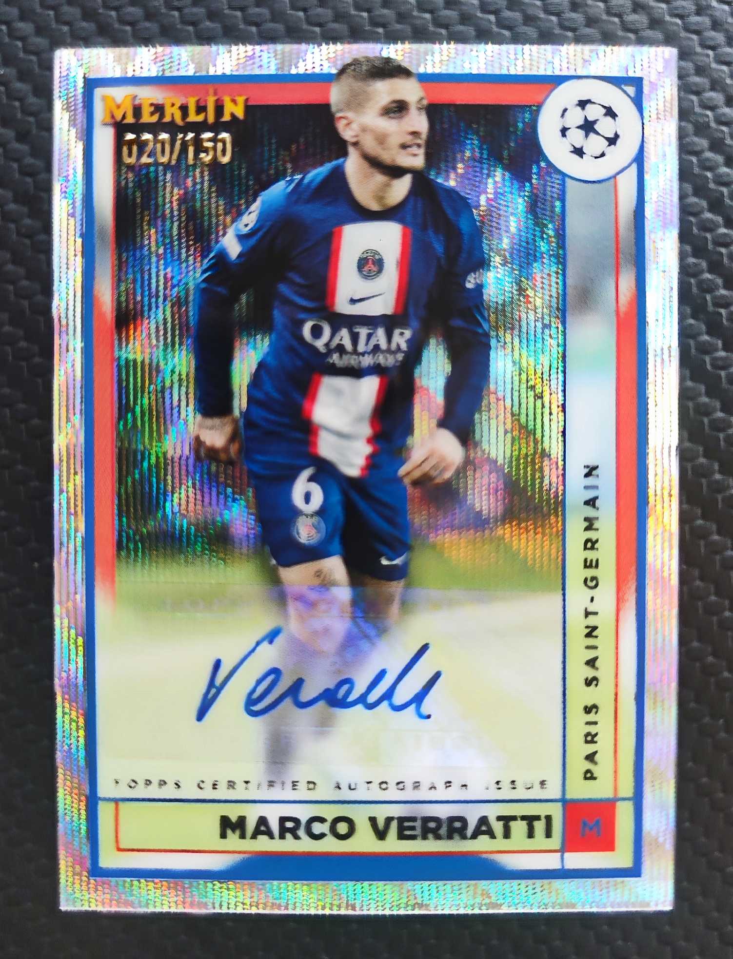 2023 Topps Merlin chrome Marco Verratti 欧冠 梅林 意大利 巴黎 维拉蒂 150编 波纹折 彩虹折射 墨迹完美 签字 签名 卡品见图 阅读描述 光明
