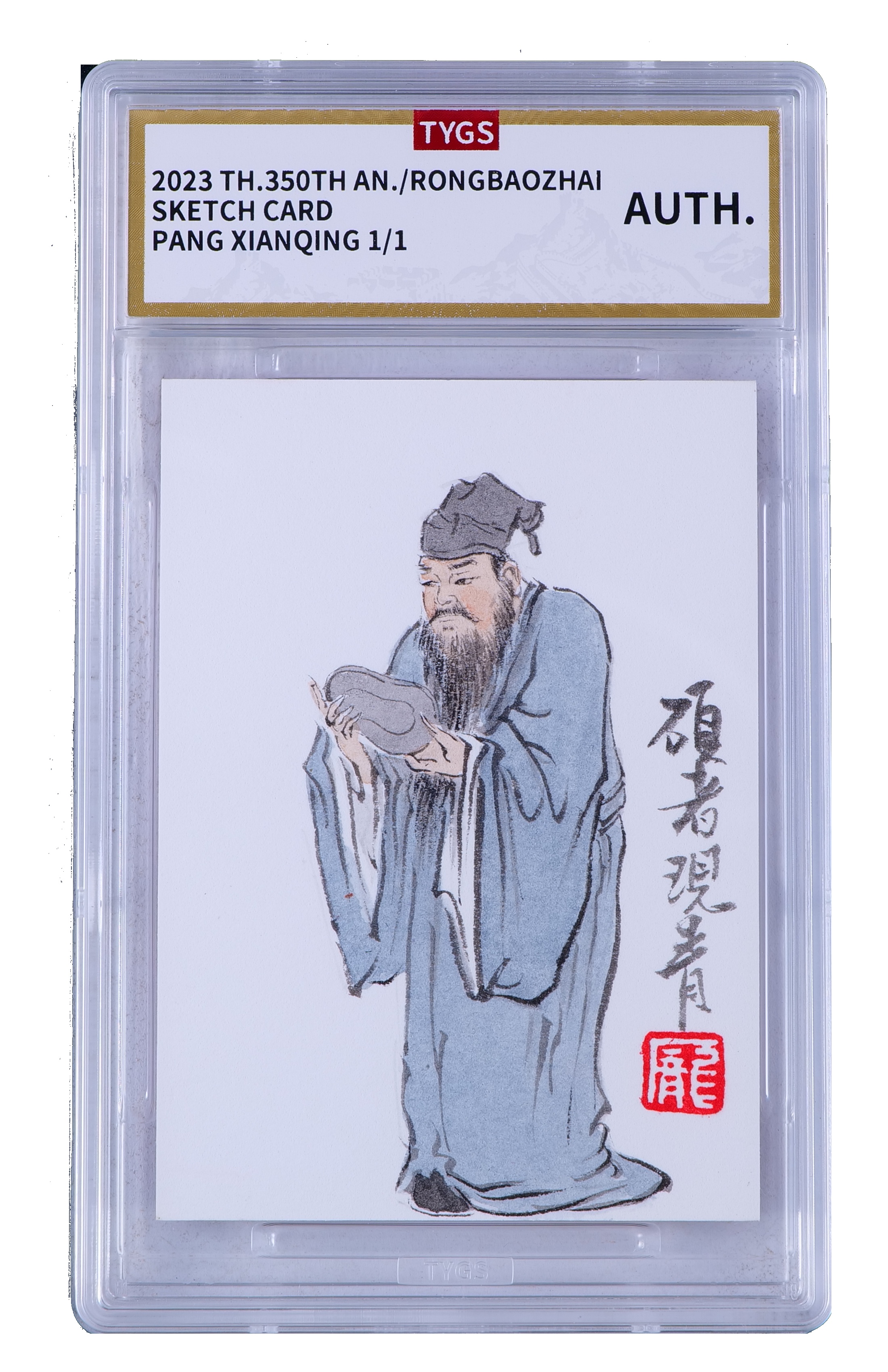 2025中版昆仑【鱼-6.15】荣宝斋纪念收藏手绘卡 现代大师 庞现青 观砚图 1/1 编 天元鉴真 收藏必备 实卡精美
