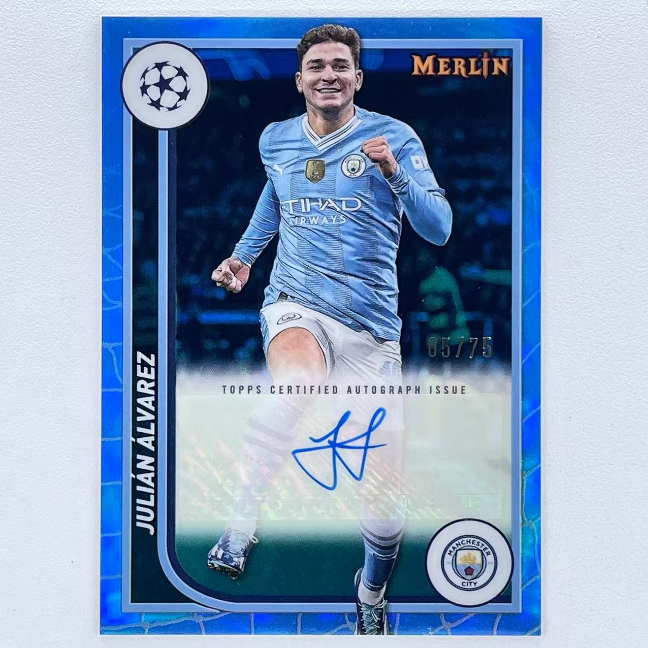 B 2023-24 Topps Merlin Chrome Julian Alvarez 朱利安 阿尔瓦雷斯 小蜘蛛 曼城 马德里竞技 阿根廷 欧冠 梅林 75编 签字 签名 蓝折 折射 轻印如图 众孚孤独@2