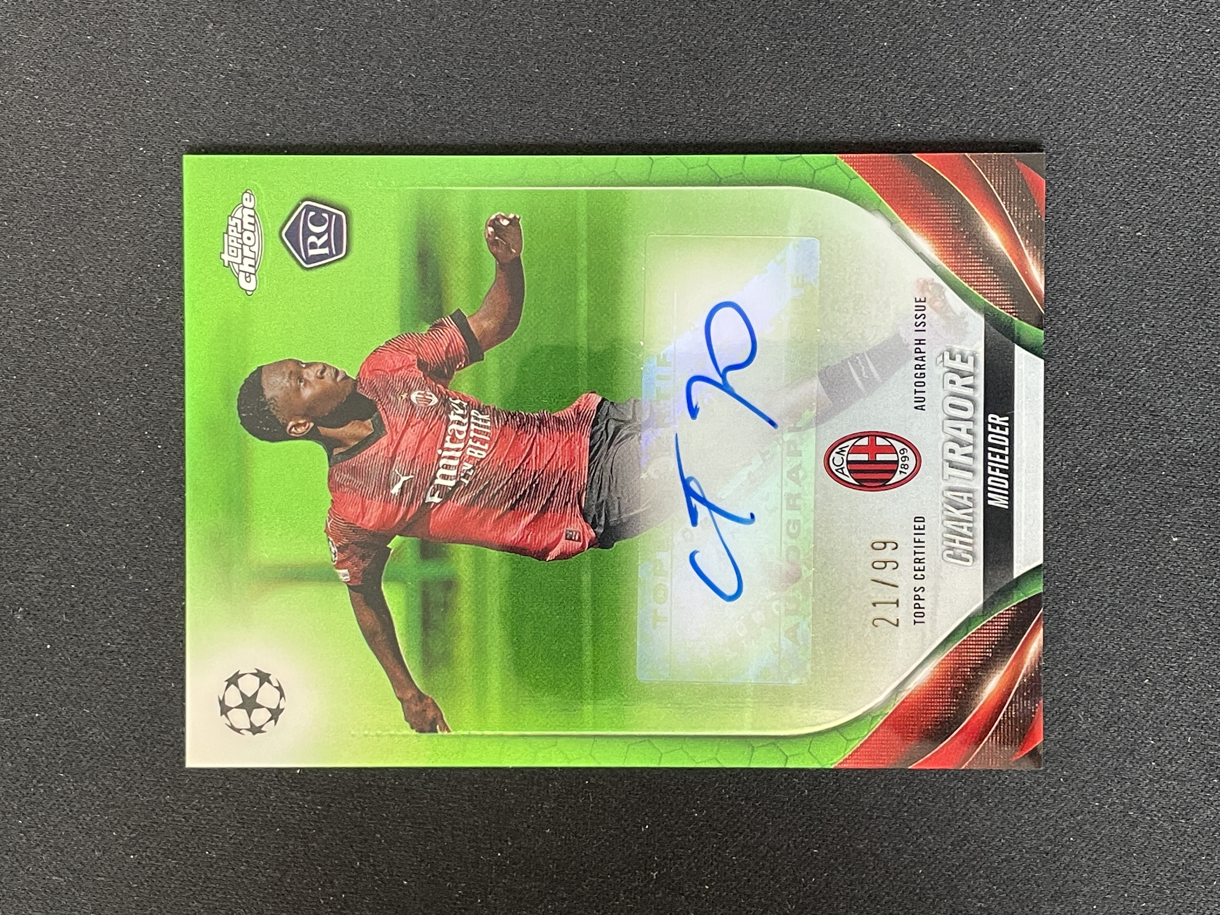 【南昌NOVA】2023-24 Topps Chrome Chaka Traore RC 欧战 欧冠 AC米兰 新秀 查卡 特拉奥雷 绿折 签字 特卡 21/99编 图34卡背瑕疵 介意勿拍 D09yz