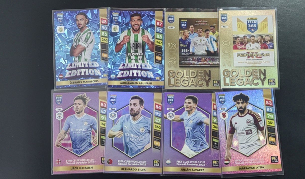 【魔都宝鉴 乔丹18】2025 Panini Adrenalyn XL FIFA365 特卡 2张蓝碎冰 2张金卡 4张粉紫折 格拉利什 阿尔瓦雷斯 贝尔纳多席尔瓦 阿布法尼 曼城 等打包 打包品相不保证