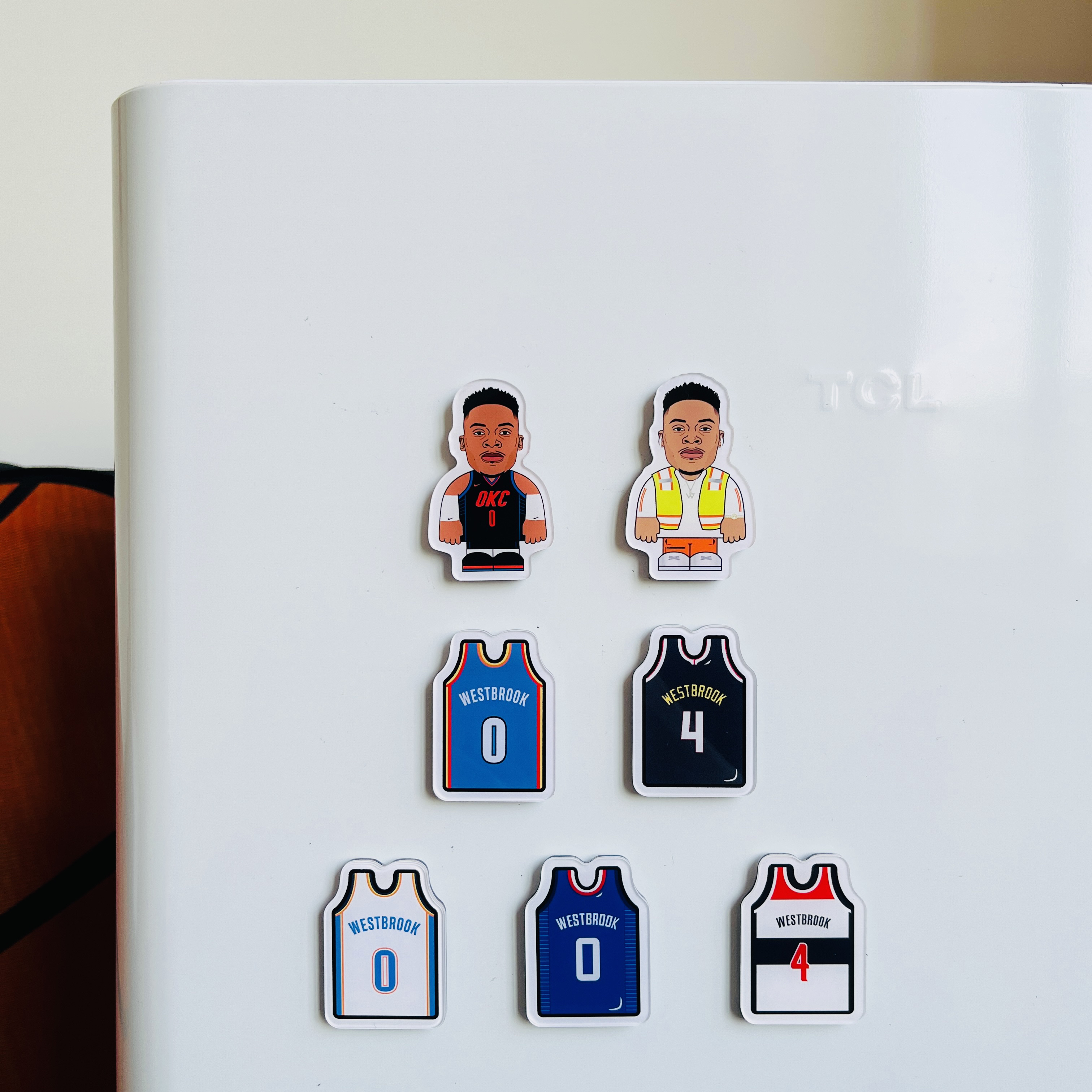 2024-25 Panini Threads Russell Westbrook 【球星卡小卡随机一张】赠送 威少 威斯布鲁克 小背心 原创冰箱贴一套7枚如图 可磁吸可粘贴 双面图案可做摆件 实物拍摄