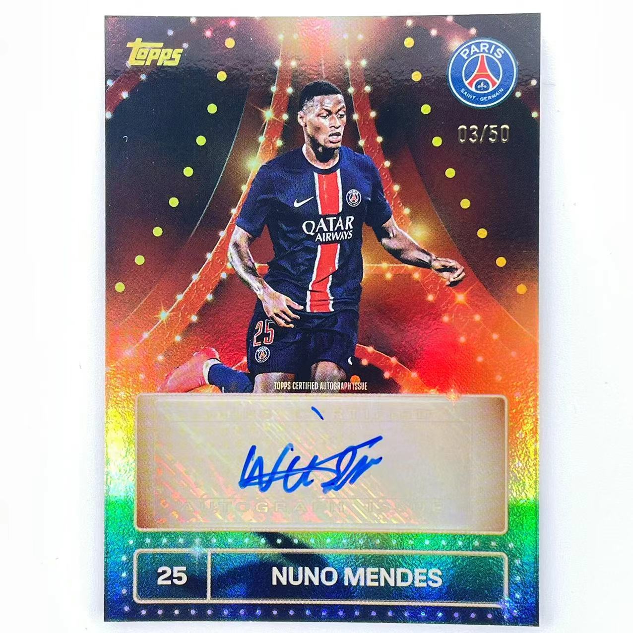 L+ 2025 Topps Paris Saint-Germain Team Set Nuno Mendes 努诺 门德斯 50编 黄折 折射 签字 签名 巴黎人表演特卡 葡萄牙 巴黎圣日耳曼 大巴黎队盒 轻印如图 众孚格拉利什@2