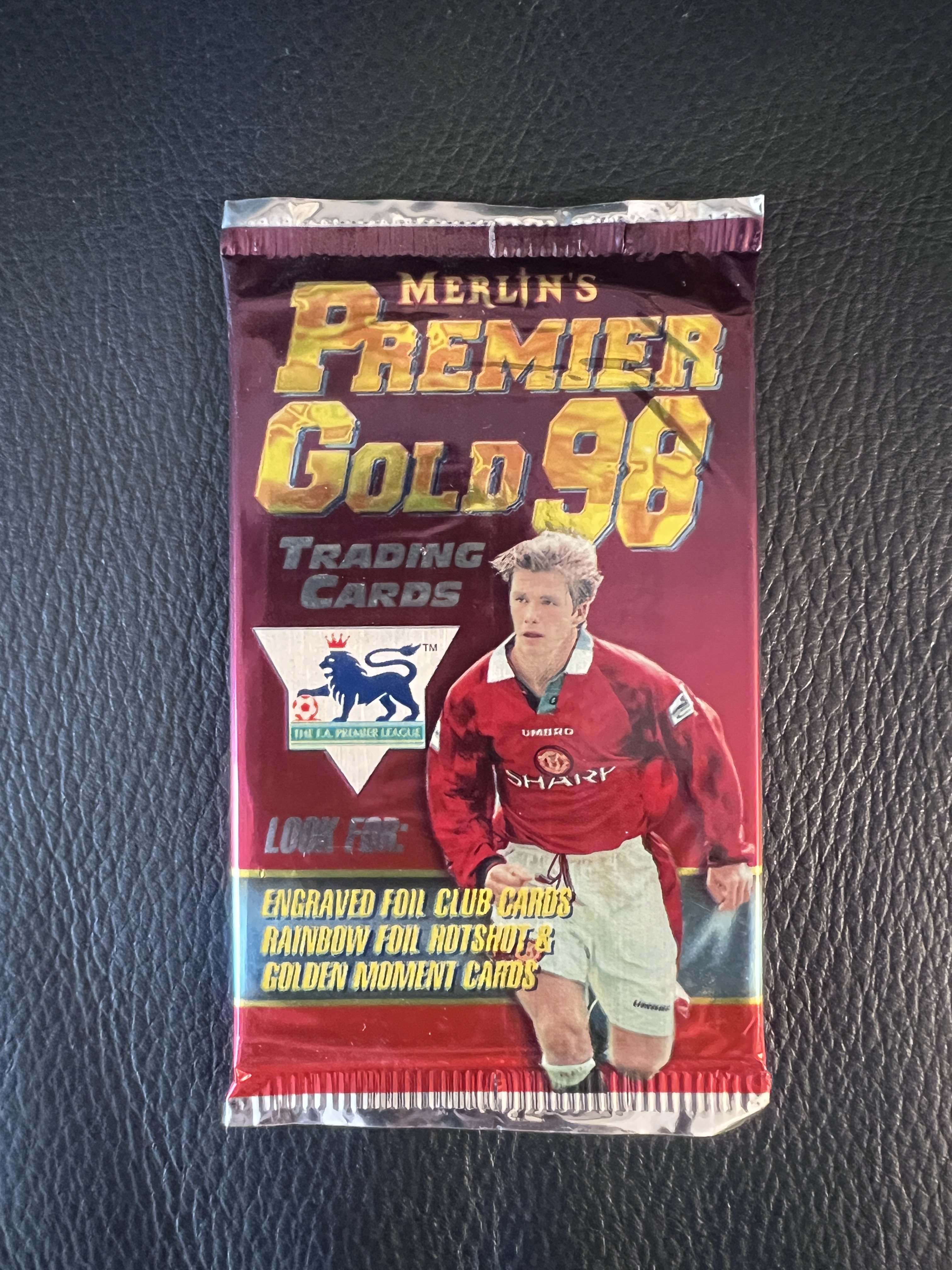 1998 Merlin Premier Gold 98 Soccer Merlin Premier Gold 98 原盒拆卖 英超 梅林 单包8张卡 寻找队徽特卡 黄金时刻特卡 彩虹烫金闪特卡