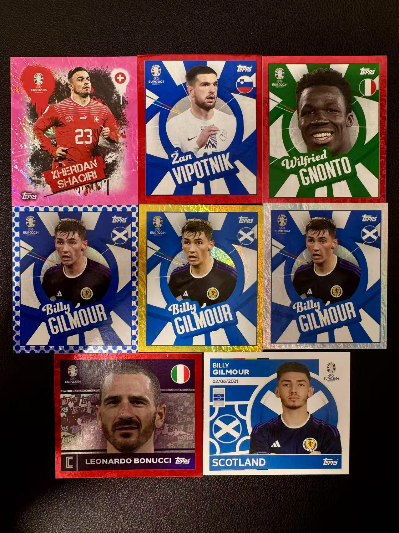 2024 Topps 欧洲杯 瑞士版 打包 【Cool卡拍卖】 贴纸 沙奇里 吉尔莫 博努奇 意大利 瑞士 苏格兰 蓝点点 topps折 大比例 粉 金 平行 卡品如图 收藏必备(TY)