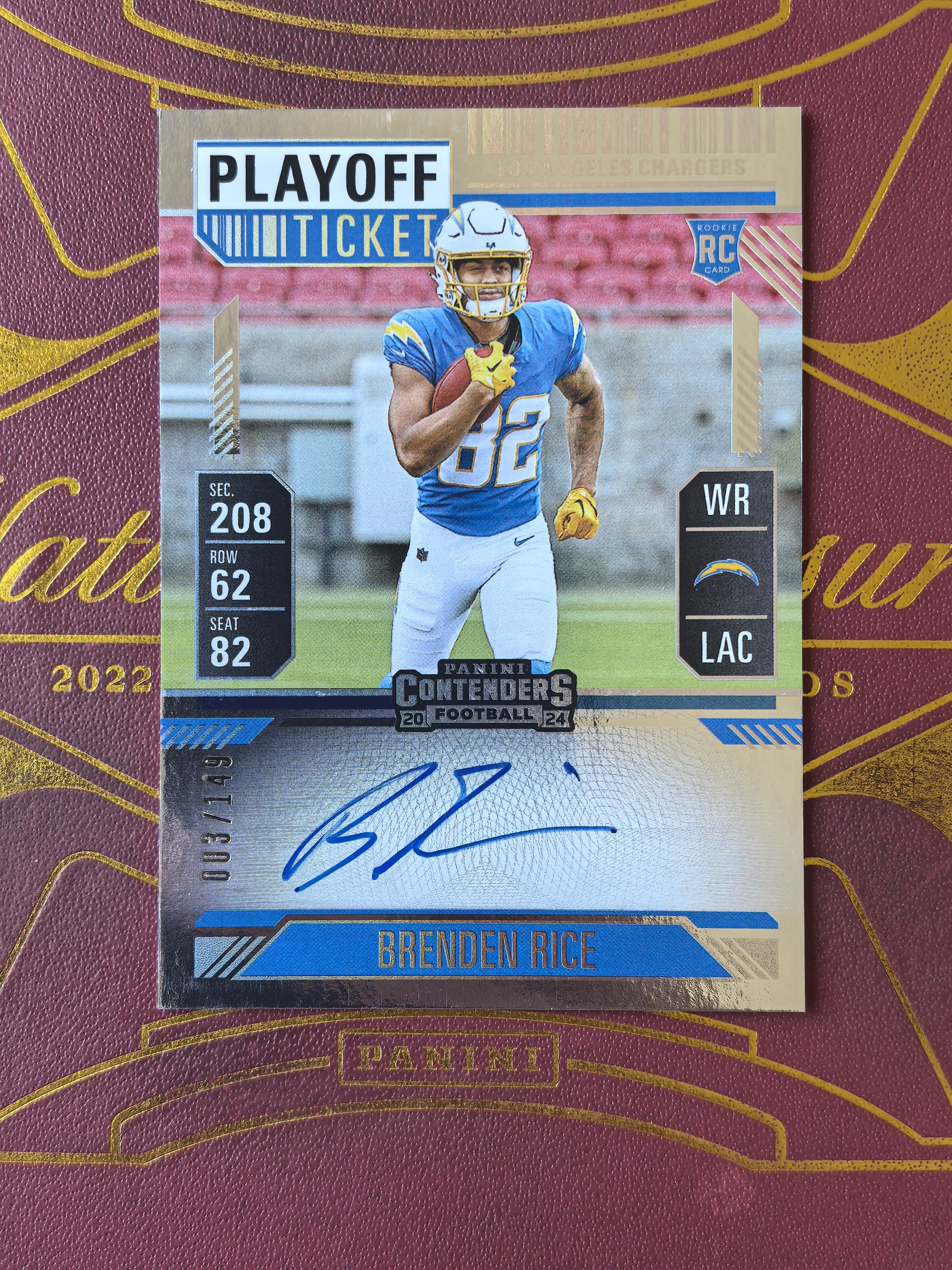2024 Panini Contenders Brenden Rice RC 卡卡星球拍卖 NFL 橄榄球 季后赛 球票 洛杉矶闪电 布兰登 莱斯 赖斯 新秀 RC 签字 卡签 完美签 3/149编