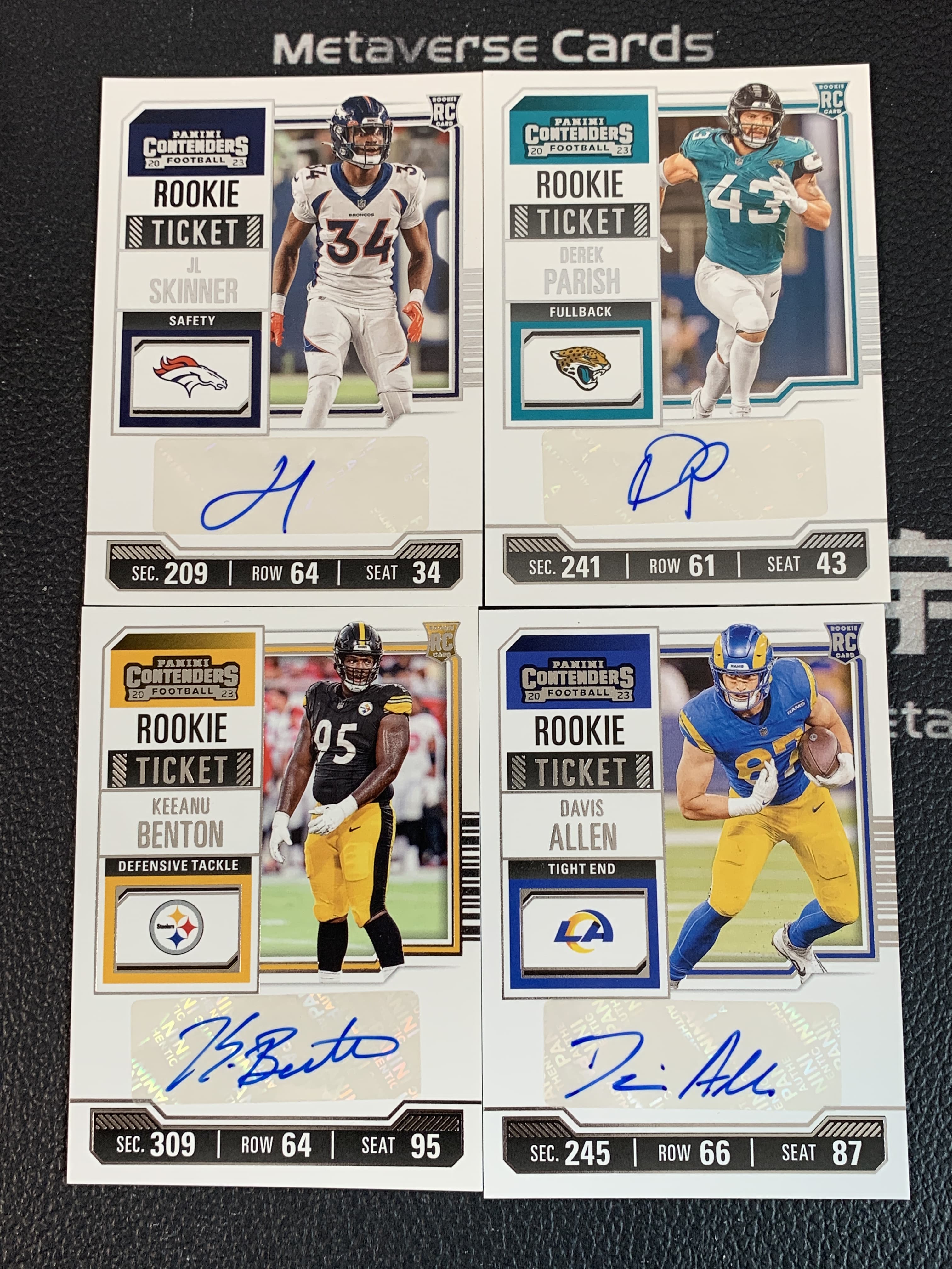 【元宇宙拍卖】CT总415:2023 Panini Contenders 橄榄球 球票 JL斯金纳 德里克帕里什 基努本顿 戴维斯阿伦 新秀RC 签字 签名 4张打包lot