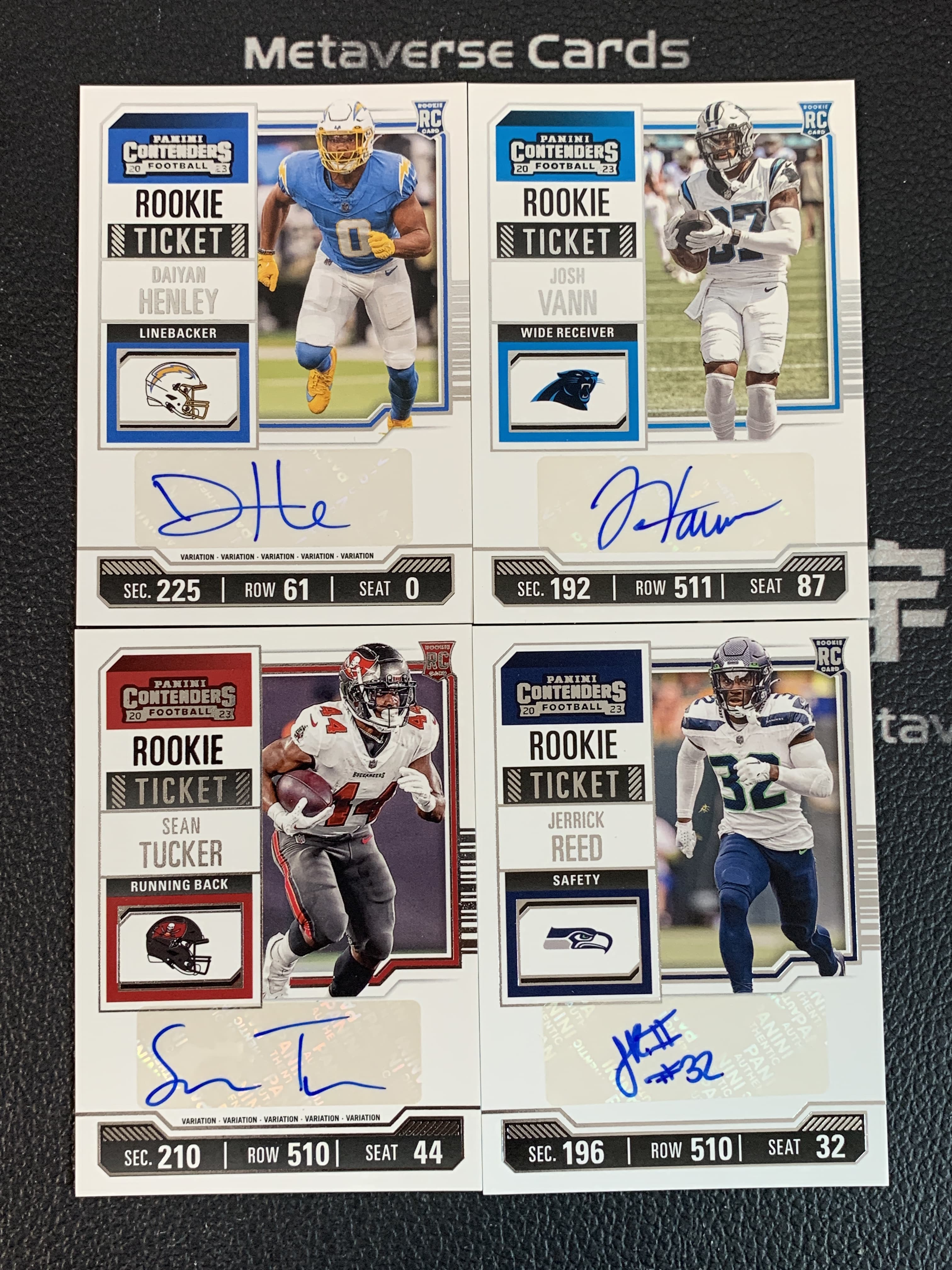 【元宇宙拍卖】CT总416:2023 Panini Contenders 橄榄球 球票 戴安亨利 约什范恩 肖恩塔克 杰里克里德 新秀RC 签字 签名 4张打包lot