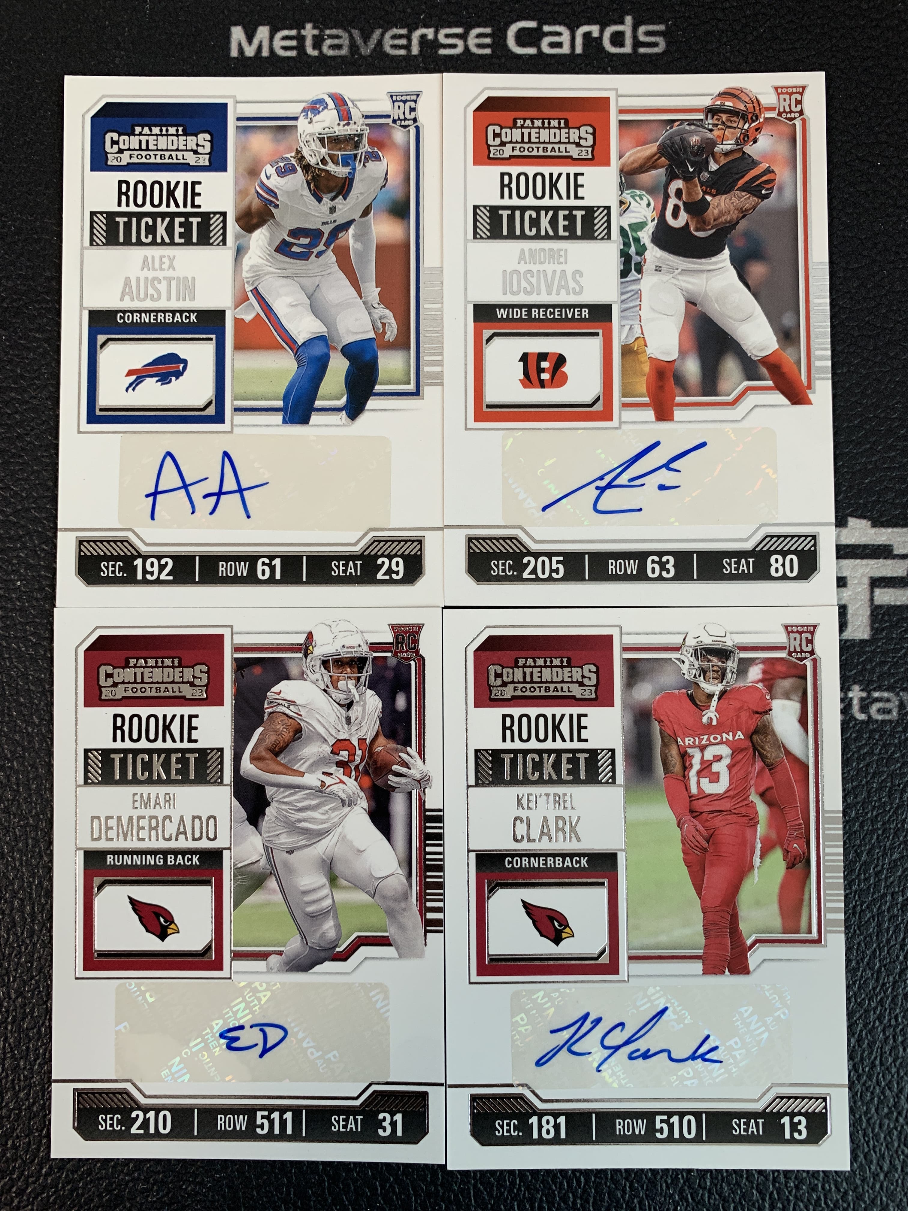 【元宇宙拍卖】CT总417:2023 Panini Contenders 橄榄球 球票 亚历克斯 奥斯汀 安德烈 卢锡瓦斯 埃马里 德梅尔卡多 凯尔特里 克拉克 新秀RC 签字 签名 4张打包lot