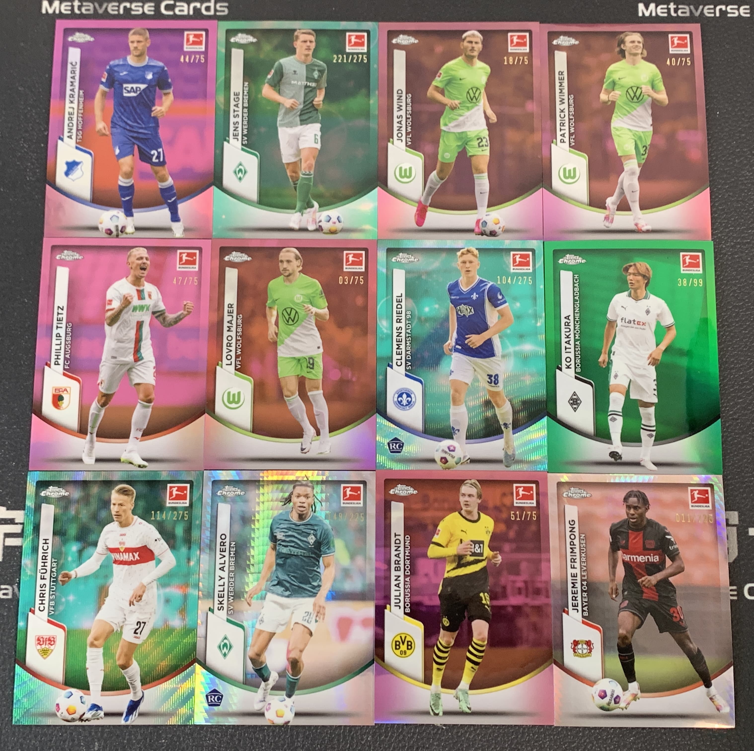 【元宇宙拍卖】顺之总073:2023-24 Topps Chrome 德甲 帕特里克 维默尔 板仓滉 杰里米 弗林蓬 乔纳斯 温德 里德尔 朱利安 布兰特 青波纹折 棱镜折 粉折 绿折 折射 75编 99编 都带编 12张lot打包