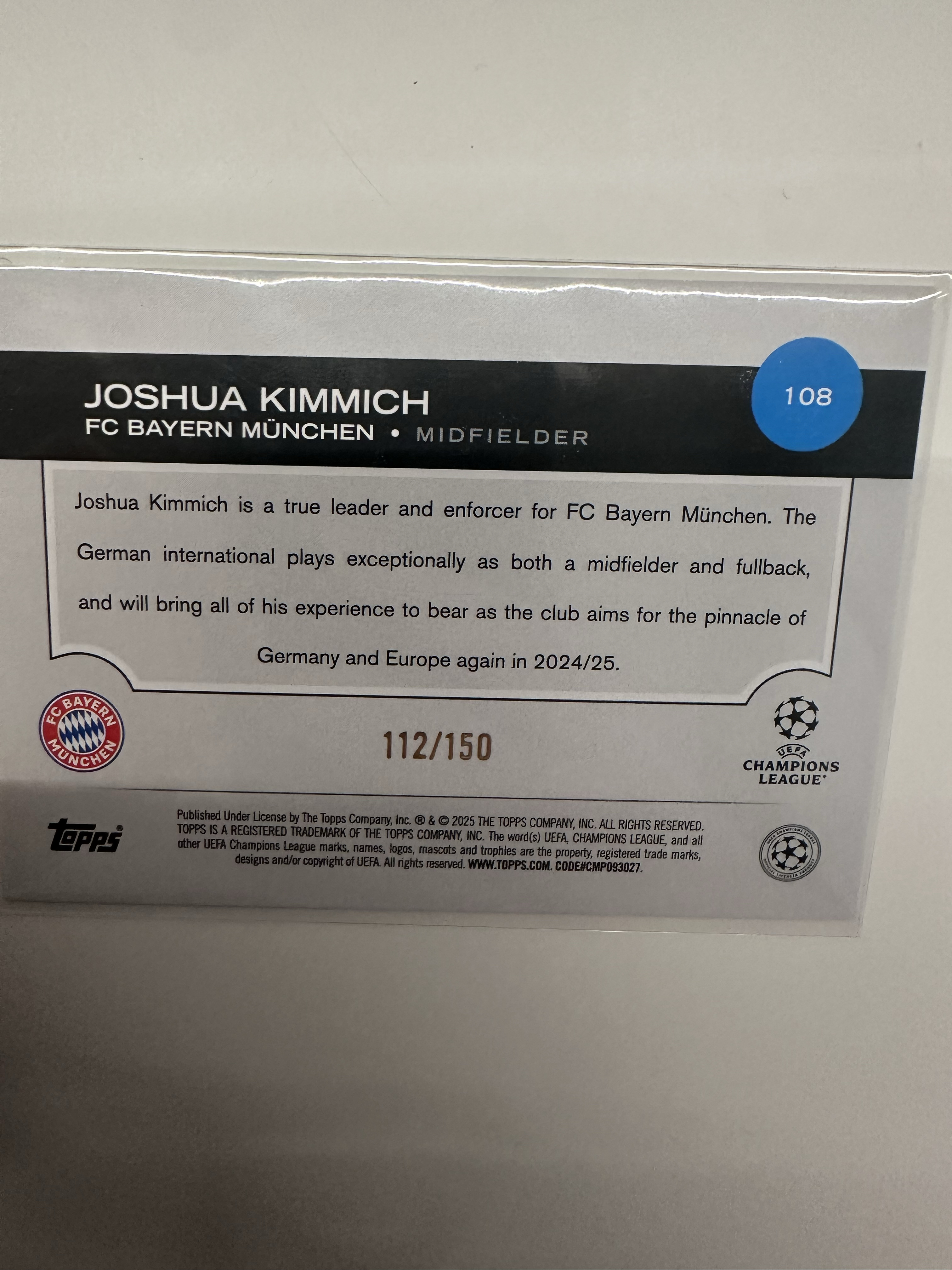 这是拜仁慕尼黑球员约书亚·基米希(Joshua Kimmich)的Topps欧冠系列球星卡,卡面编号108,限量150张(此为112/150 )。基米希是德国国脚,可踢中场与边后卫,是拜仁的领袖与骨干,2024/25赛季将凭经验助球队冲击德国内及欧洲赛场荣誉 。