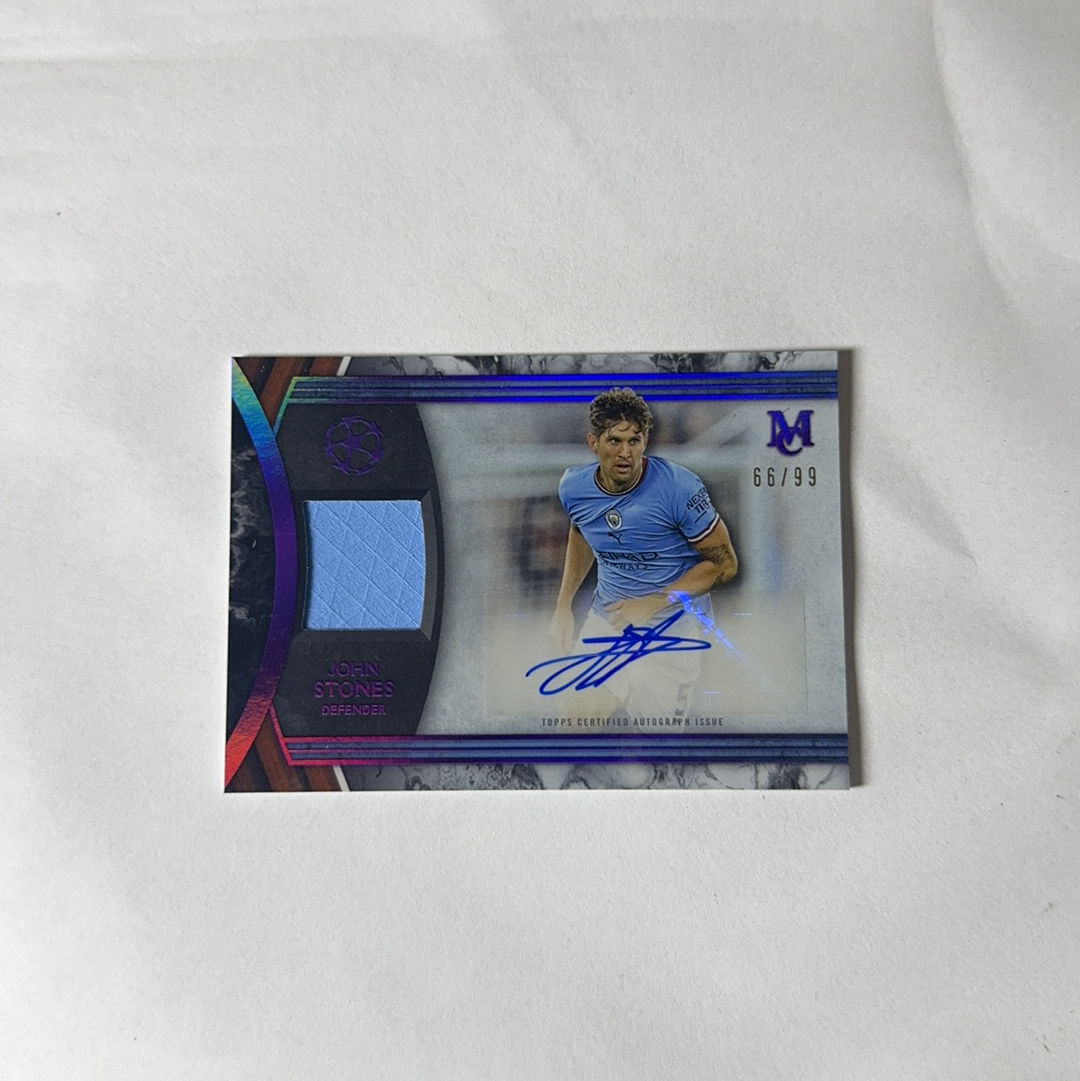 2022-23 Topps 博物馆 John Stones 欧冠博物馆 曼城 曼彻斯特城 约翰 斯通斯 单窗 物料 湖水蓝闪 JA签字 贴签 66/99编 卡品如图 荣