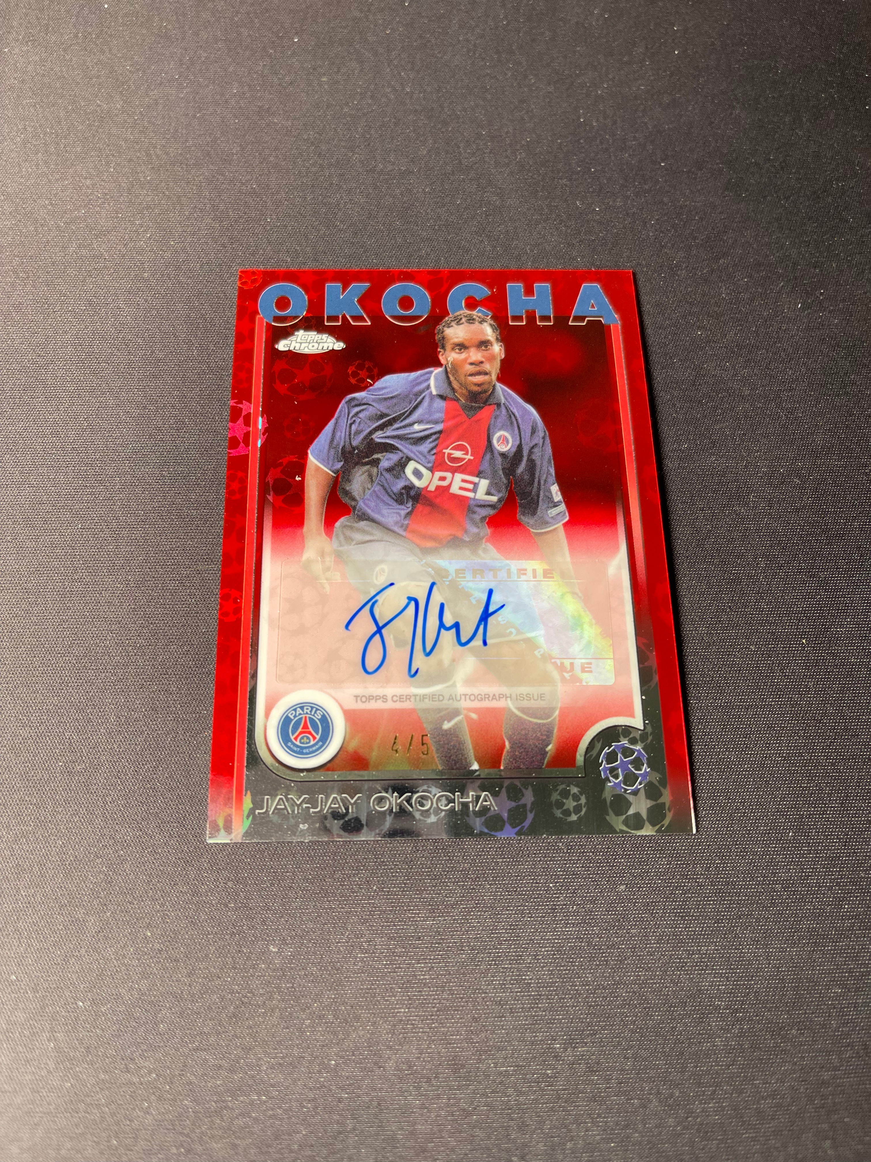 2024-25 Topps Chrome Jay-Jay Okocha UCC 巴黎圣日耳曼 杰伊-杰伊·奥科查 红欧冠球折 签字 折射 4/5编 瑕疵如图 不累计「老夫子」tytony
