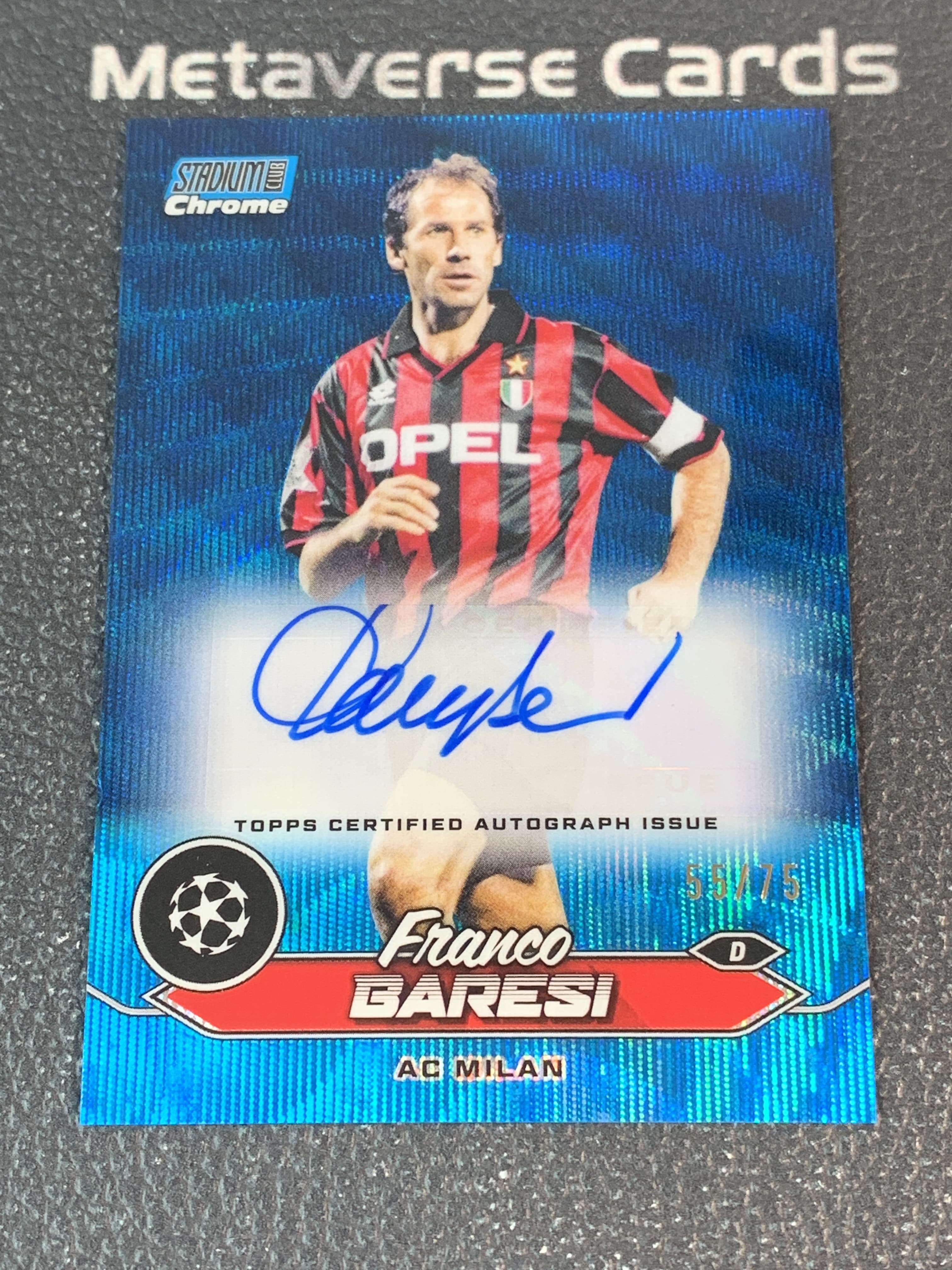 【元宇宙拍卖】K14-015:2023-24 Topps Stadium Chrome Franco Baresi 欧冠 竞技场 AC米兰 巴雷西 55/75编 蓝波纹折 蓝折 折射 签字 微瑕如图 专收收藏必备