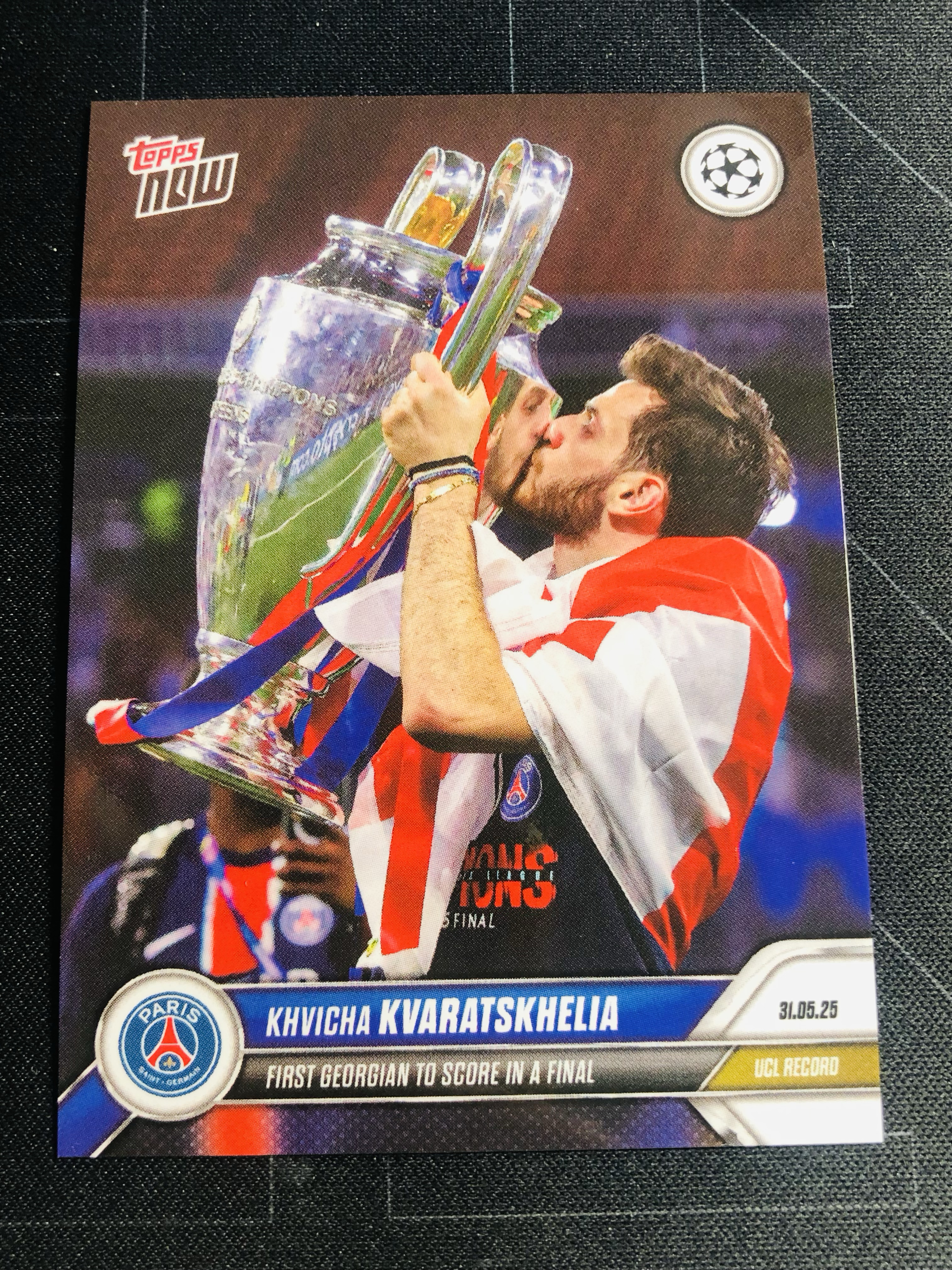 2025 Topps Now Khvicha Kvaratskhelia 【MJ23代拍】最新系列 克瓦拉茨赫利亚 巴黎圣日耳曼 大巴黎欧冠冠军超帅捧杯庆祝选图特卡 亲吻奖杯时刻记录 背面防伪折射