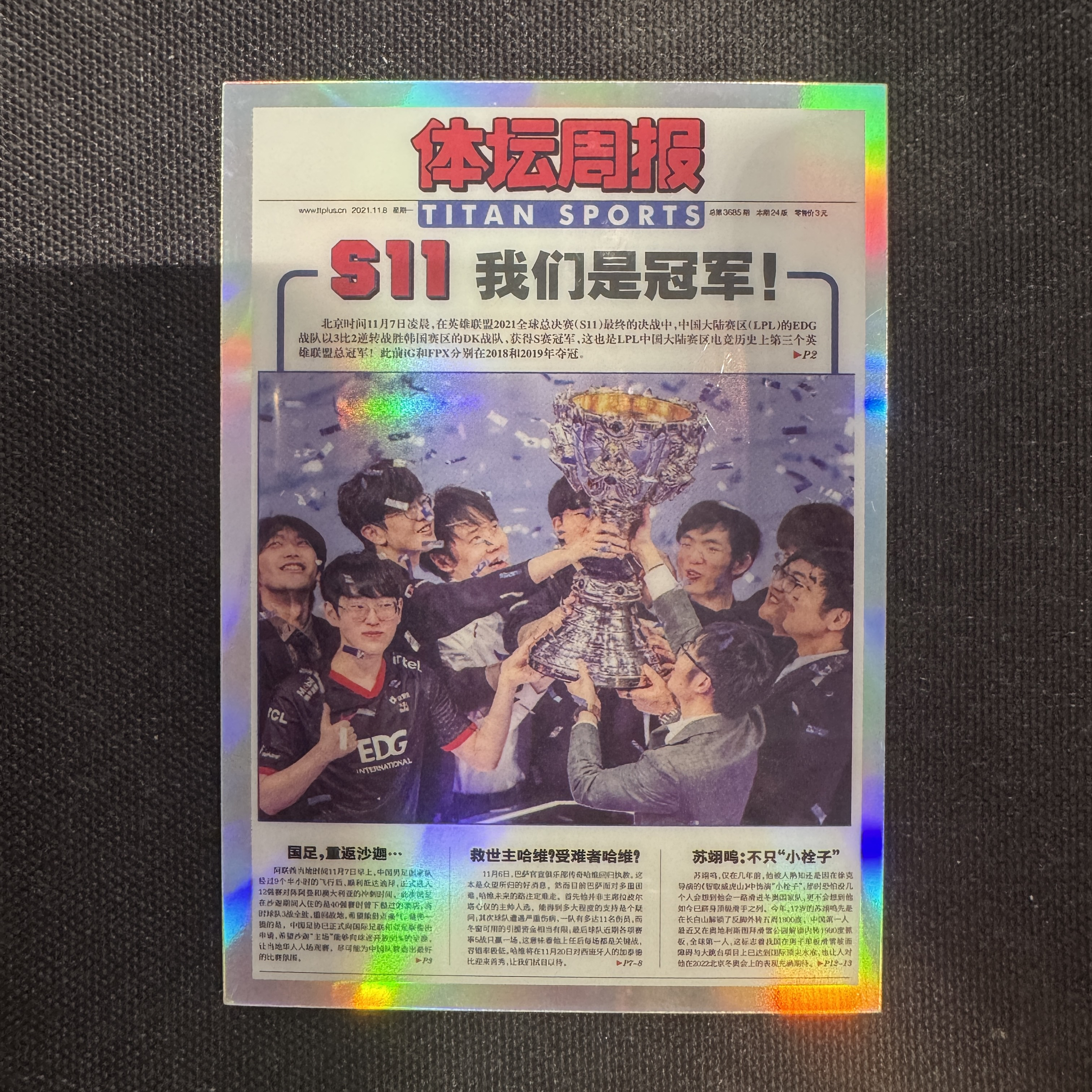 2023-24 TMG 体坛周报 EDG 【阿飒代拍】4000期纪念 第3685期 中国战队EDG战胜韩国DK战队 获得英雄联盟S11总冠军 EDG 折射 银折 专收 凑套 卡品如图 71