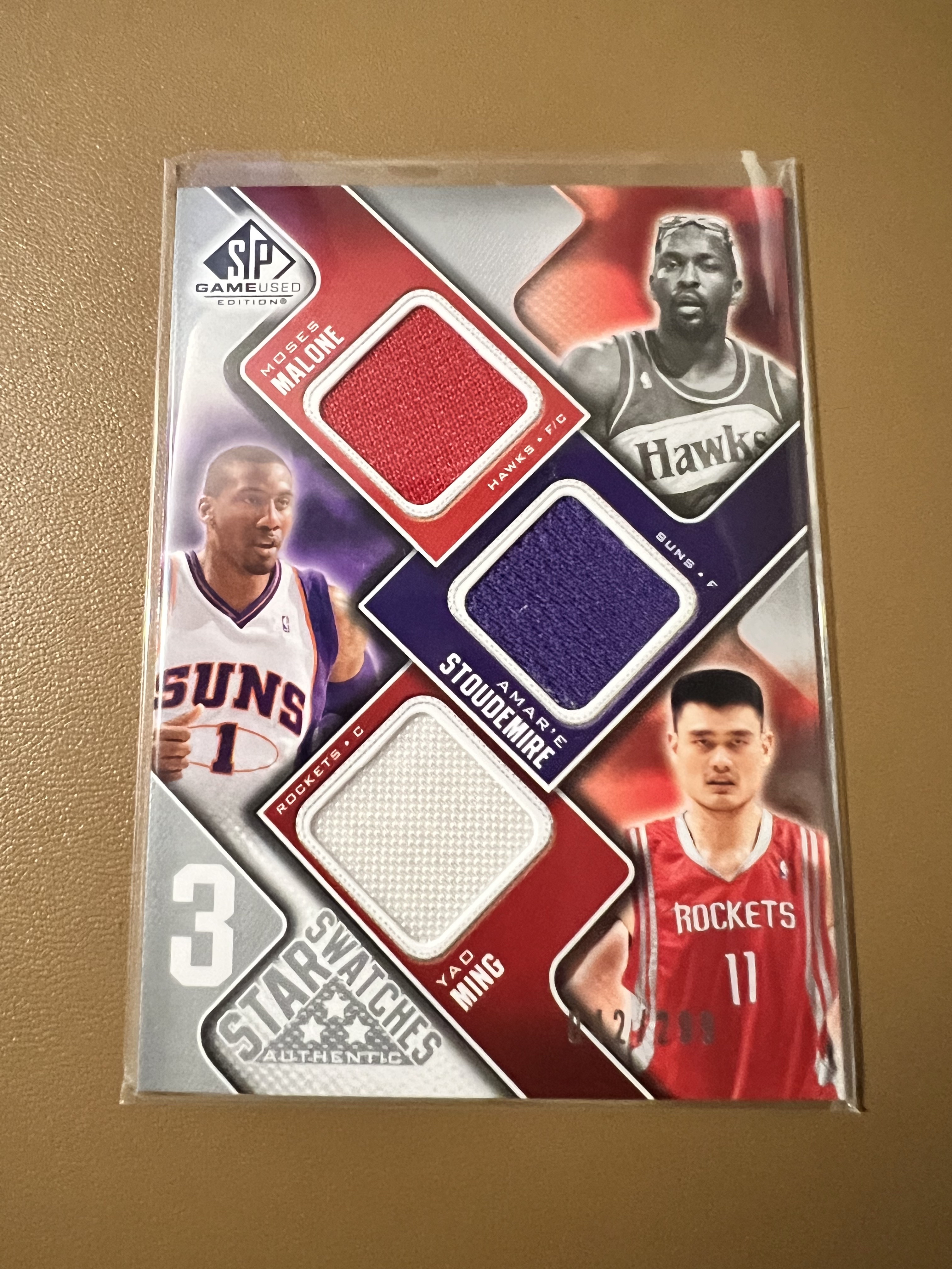 2009-10 Upper Deck SP Game Used Edition Yao Ming /299,姚明&斯塔德迈尔&摩西马龙,经典SPGU系列,三球衣卡,限量299张,少见三人同框值得收藏!