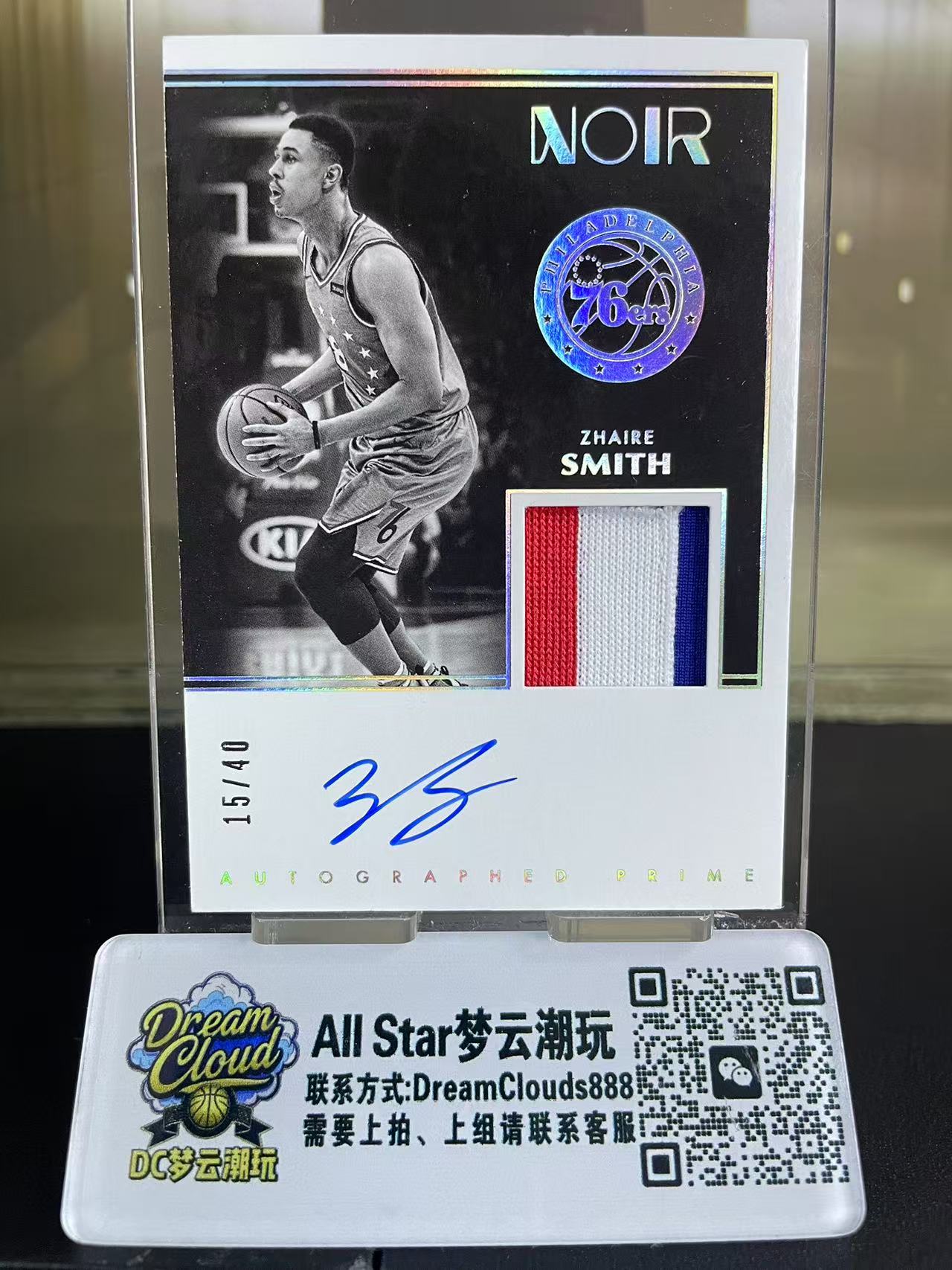 2019-20 Panini Noir Zhaire Smith 【DC梦云潮玩】诺尔系列 费城76人 扎伊尔 史密斯 15/40编 签字卡签 GU落场亲穿 三色球衣 切割物料 卡品如图 莎