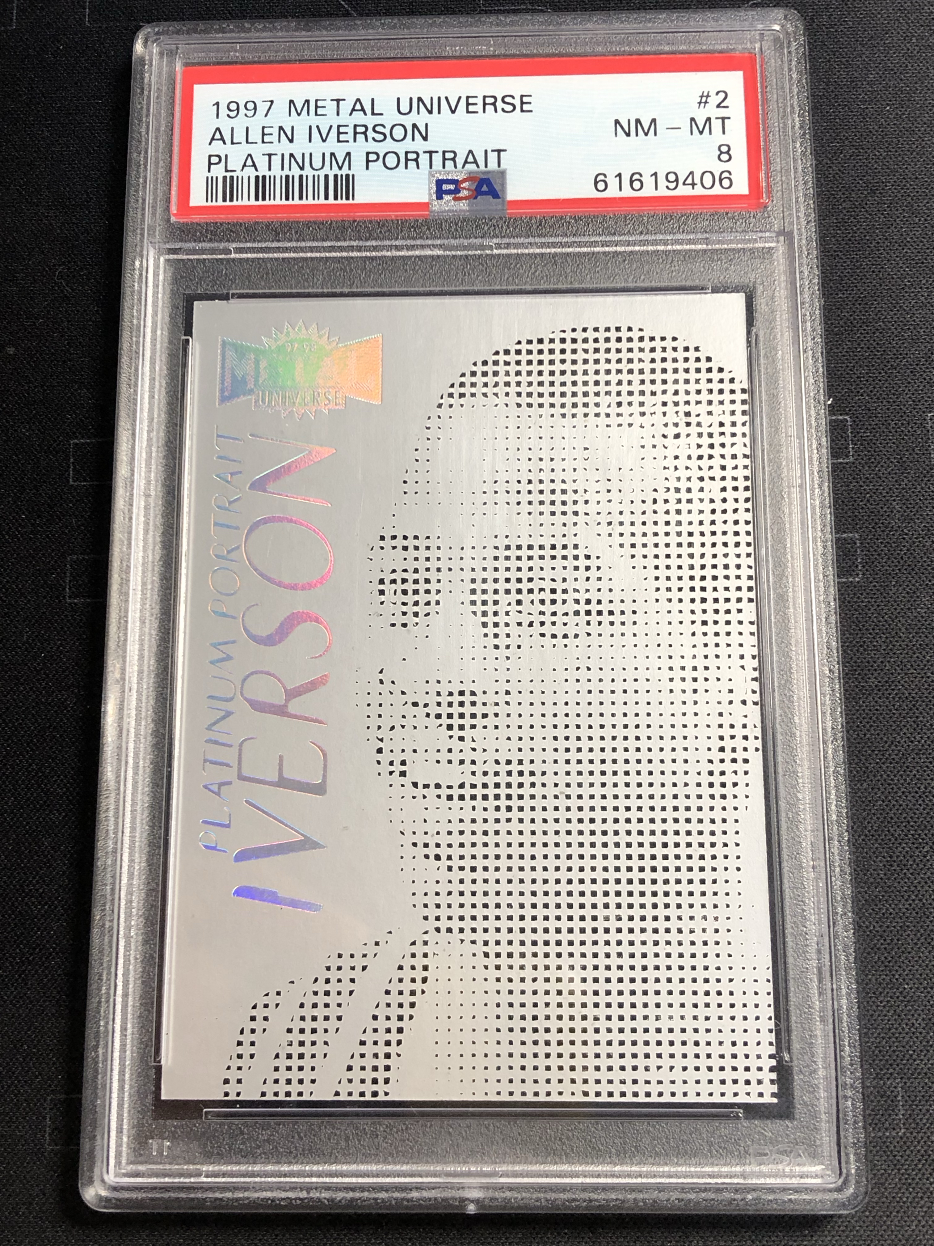 1997-98 Upper Deck Metal Allen Iverson 【MJ23代拍】红绿宝同系列 76人 阿伦艾弗森 艾佛森 元年白金肖像 镂空设计 1:288大比例老特卡PSA8评级 WB