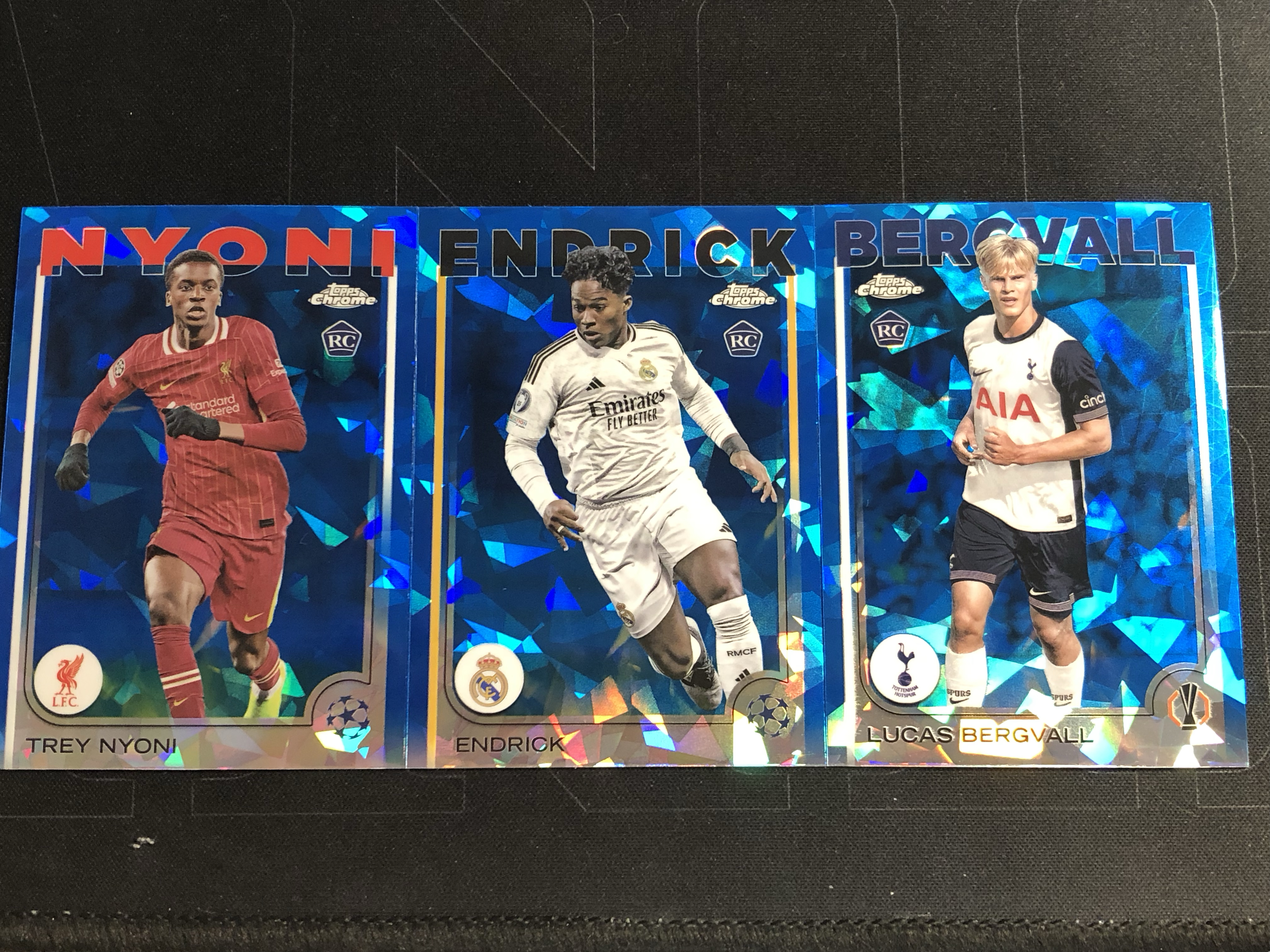 【MJ23代拍】2025 Topps Chrome 欧冠TC蓝宝石 Nyoni 特雷 恩约尼&Bergvall 贝里瓦尔&Endrick 恩德里克 RC蓝碎冰折射 三张新秀lot 不包卡品 好嗨
