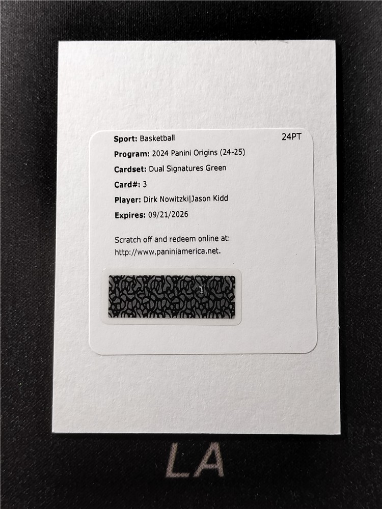 【LA拍卖】2024-25 Panini Origins Jason Kidd 起源 贾森 基德 篮网独行侠 三双先生 75大巨星 诺维斯基 诺维茨基 司机 独行侠 德国战车 小牛领袖 绿版 双人签字 /5编 超低编 交换 B81D