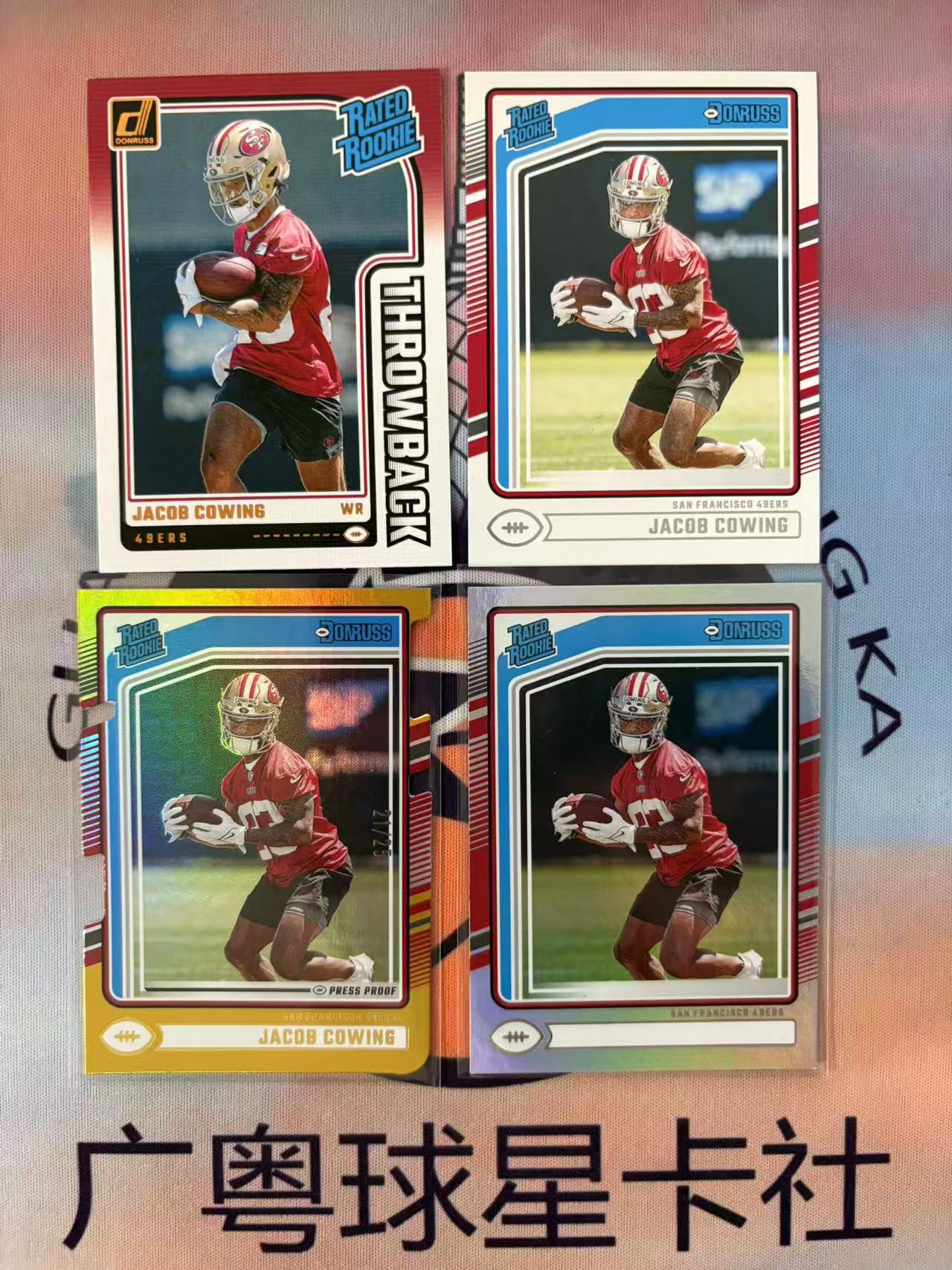 2024 Panini Donruss Jacob Cowing RC 【广粤】橄榄球 NFL 新秀RC 雅各布 旧金山49人 金折 21/25编 低编 异形卡 银折 折射 4张打包 卡品如图