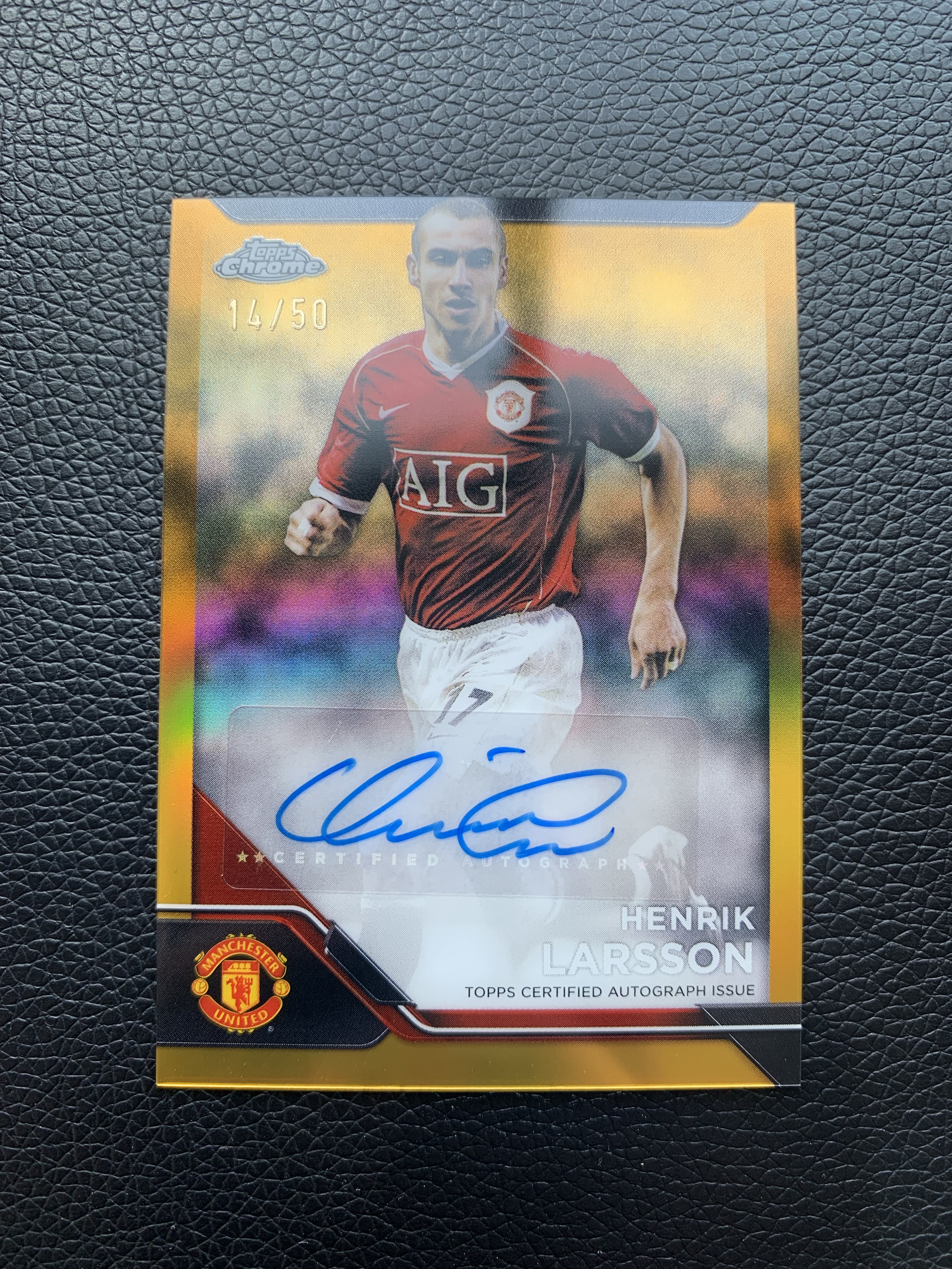 2025 Topps Chrome Henrik Larsson 曼联队盒 高端队盒 曼彻斯特联 亨里克 拉尔森 瑞典传奇 14/50编 签字 金折签 金折 红魔必备 传奇 鲁尼 C罗 坎通纳队友
