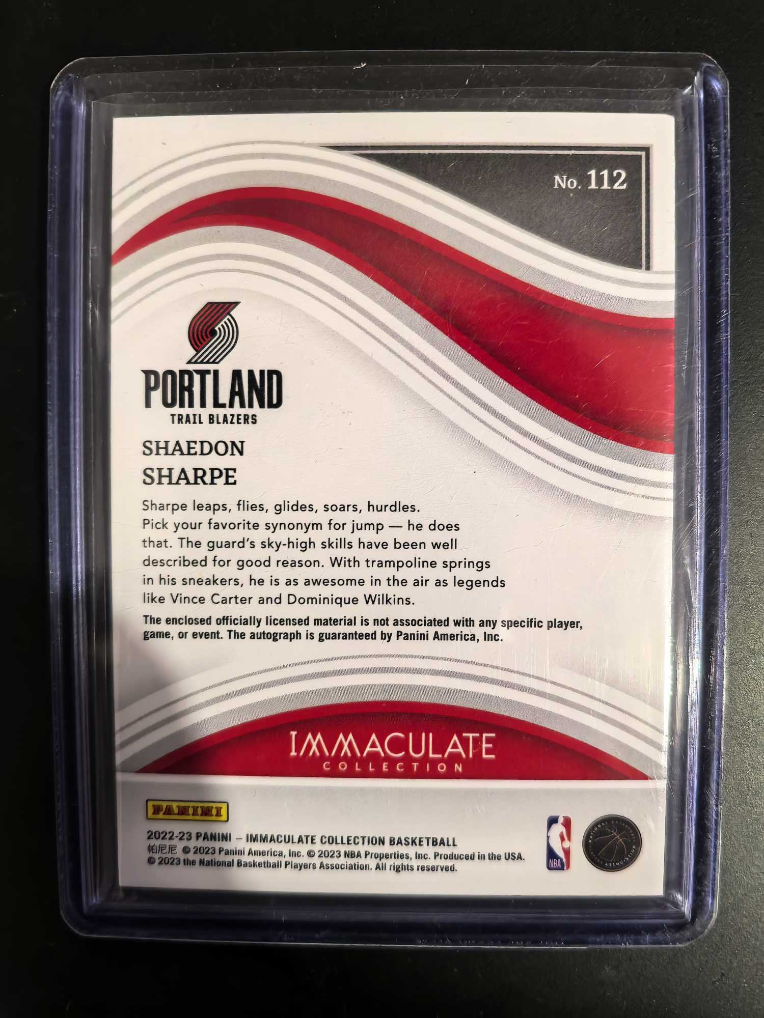 2022-23 Panini Immaculate Shaedon Sharpe 谢登 夏普 /99编 签字 完美签 新秀rc 卡签 波特兰开括者 杨瀚森队友 物料签 rpa patch