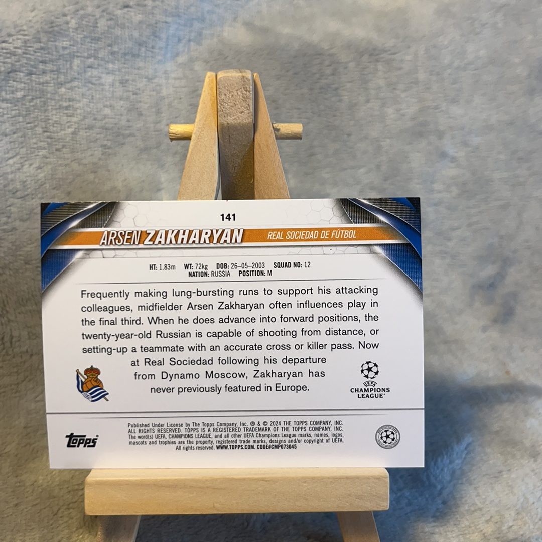 2024 Topps UEFA Champions League Arsen Zakharyan 扎哈里扬 皇家社会 西甲 RC 新秀 欧冠 冠军 碧玉 折射 特卡 收藏必备