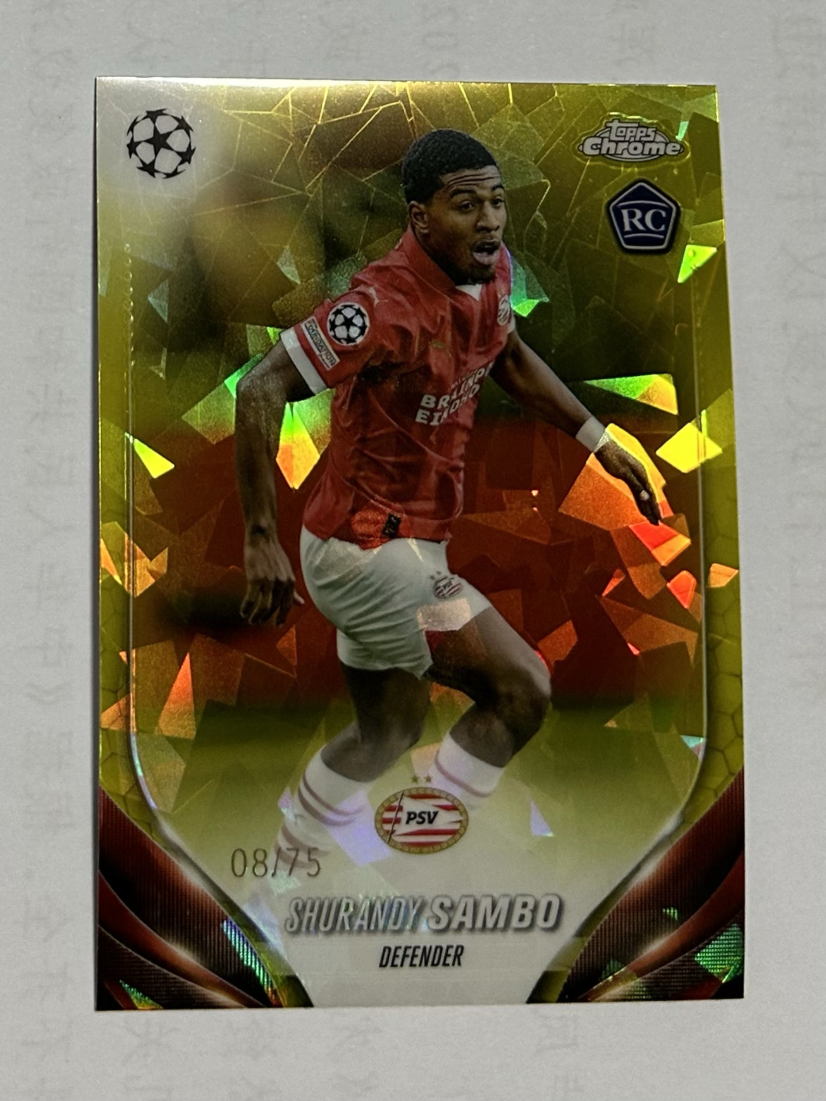 2023-24 Topps Chrome Shurandy Sambo RC 欧冠 蓝宝石 Sapphire 舒兰迪 桑博 埃因霍温 /75编 黄碎冰折 新秀 转会伯恩利 库拉索
