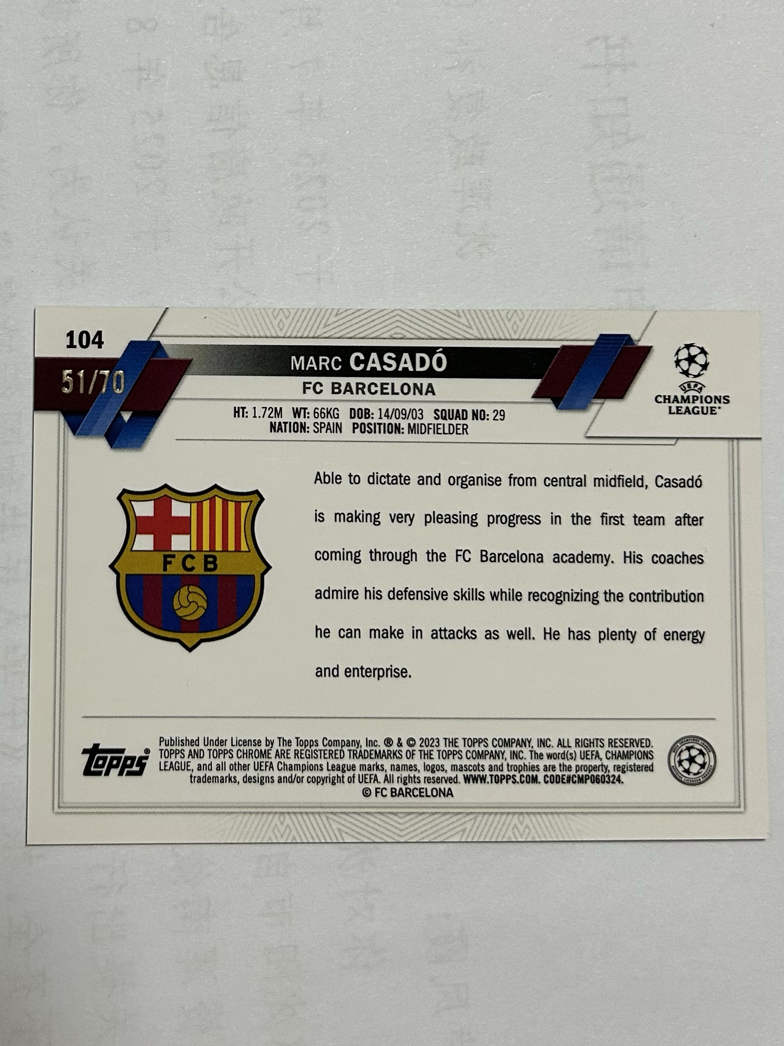 2022-23 Topps Chrome Marc Casadó RC 欧冠 蓝宝石 Sapphire 马克 卡萨多 巴萨 /70编 绿碎冰折 新秀 西班牙 亚马尔 队友