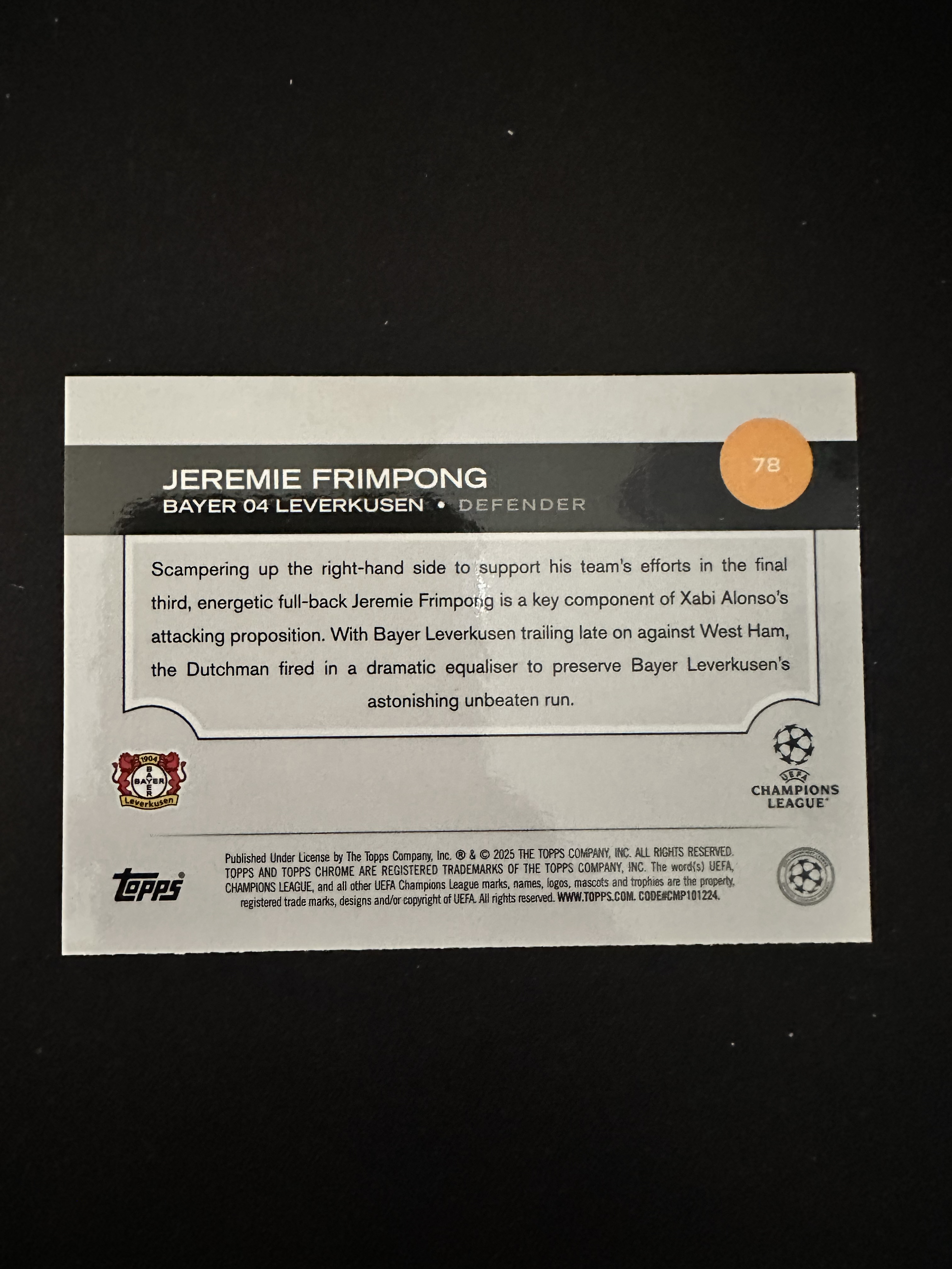 2024-25 Topps Chrome Jeremie Frimpong 欧冠Chrome 勒沃库森 利物浦 弗林蓬 199编 卡片精美 收藏必备 刺客-落枫