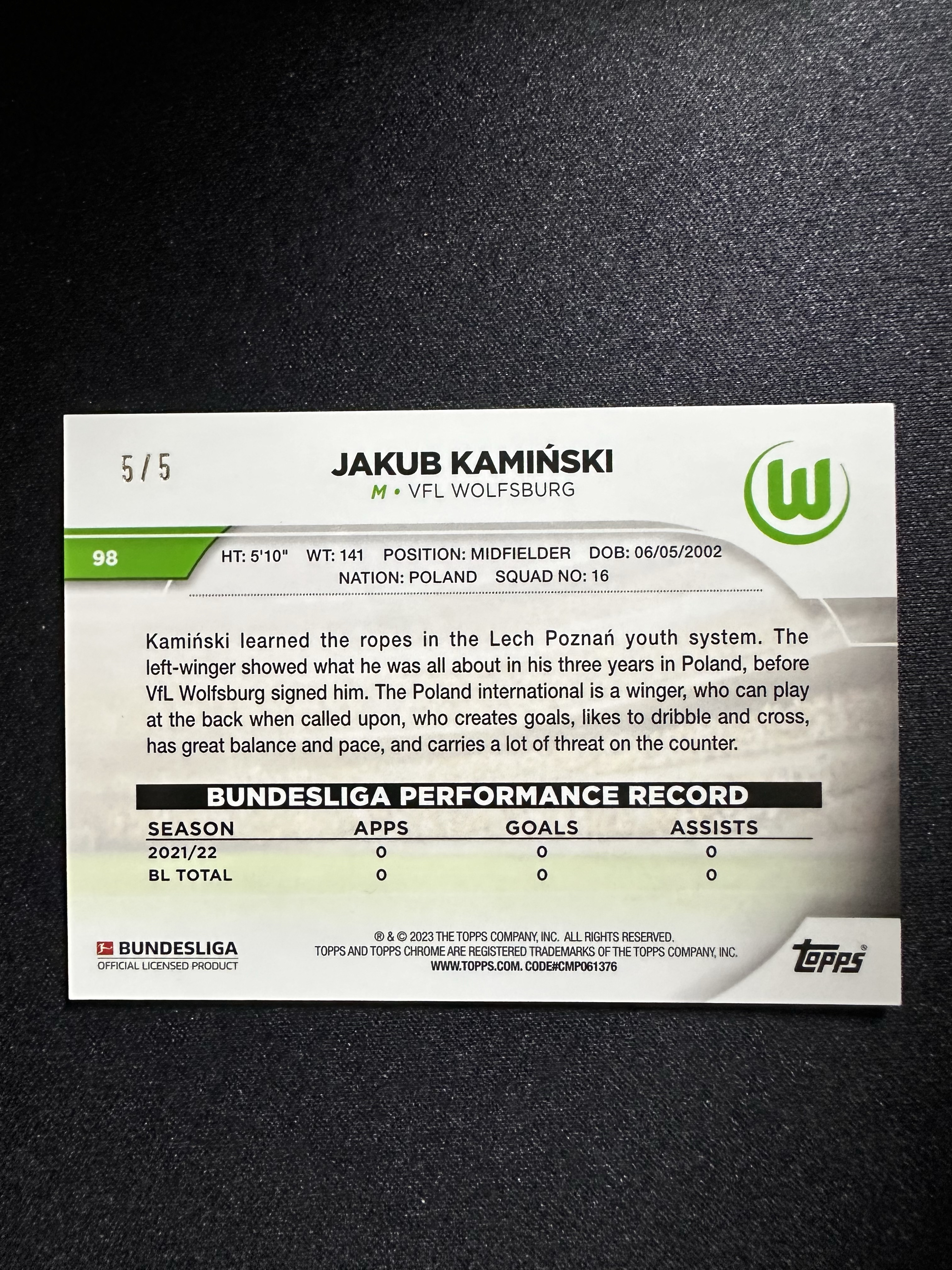 2022-23 Topps Chrome JAKUB KAMINSKI RC 德甲Chrome 沃尔夫斯堡 科隆 卡明斯基 新秀RC 5/5 5编 豪门猎物 卡片精美 收藏必备 刺客-YOLO