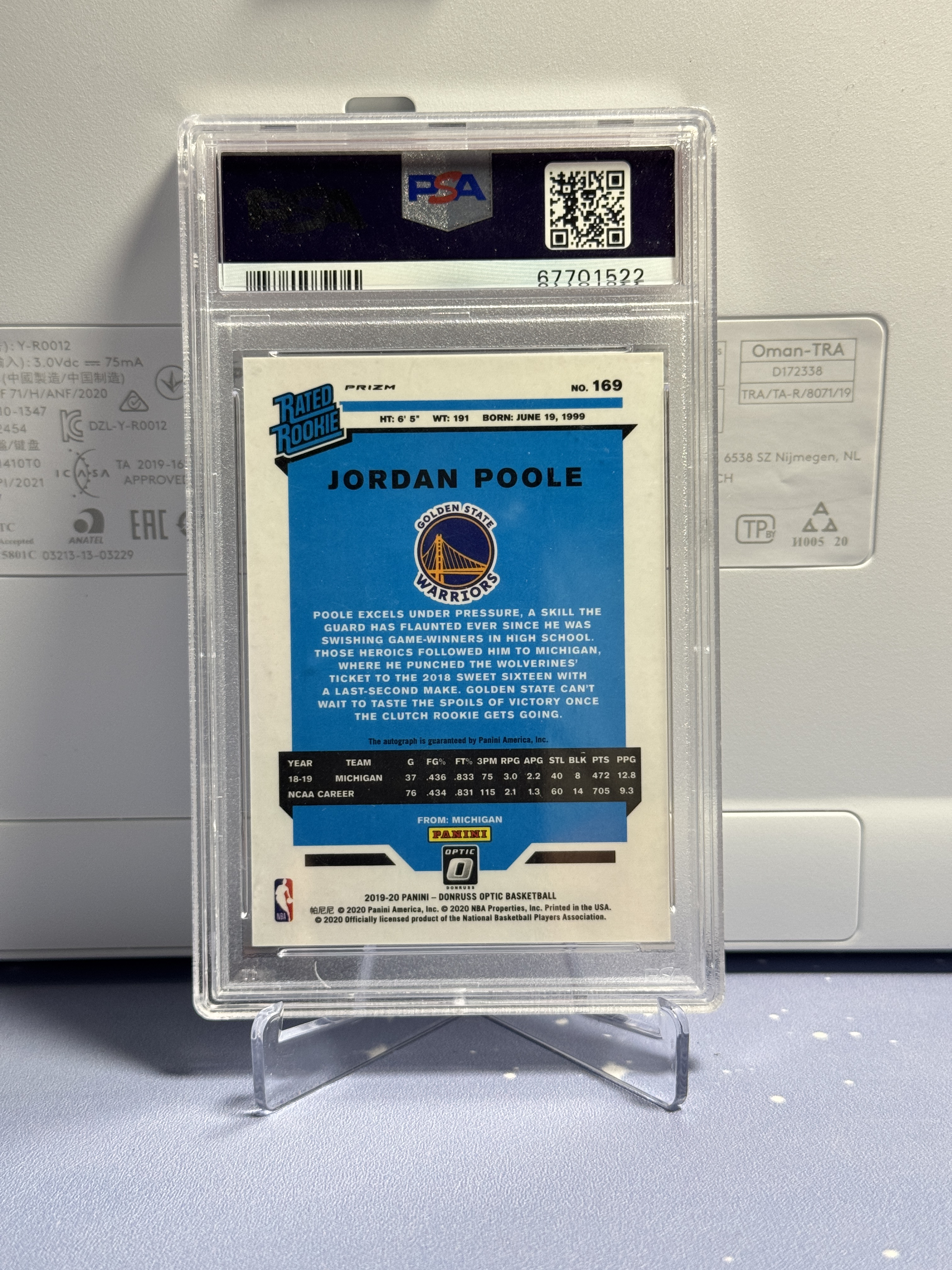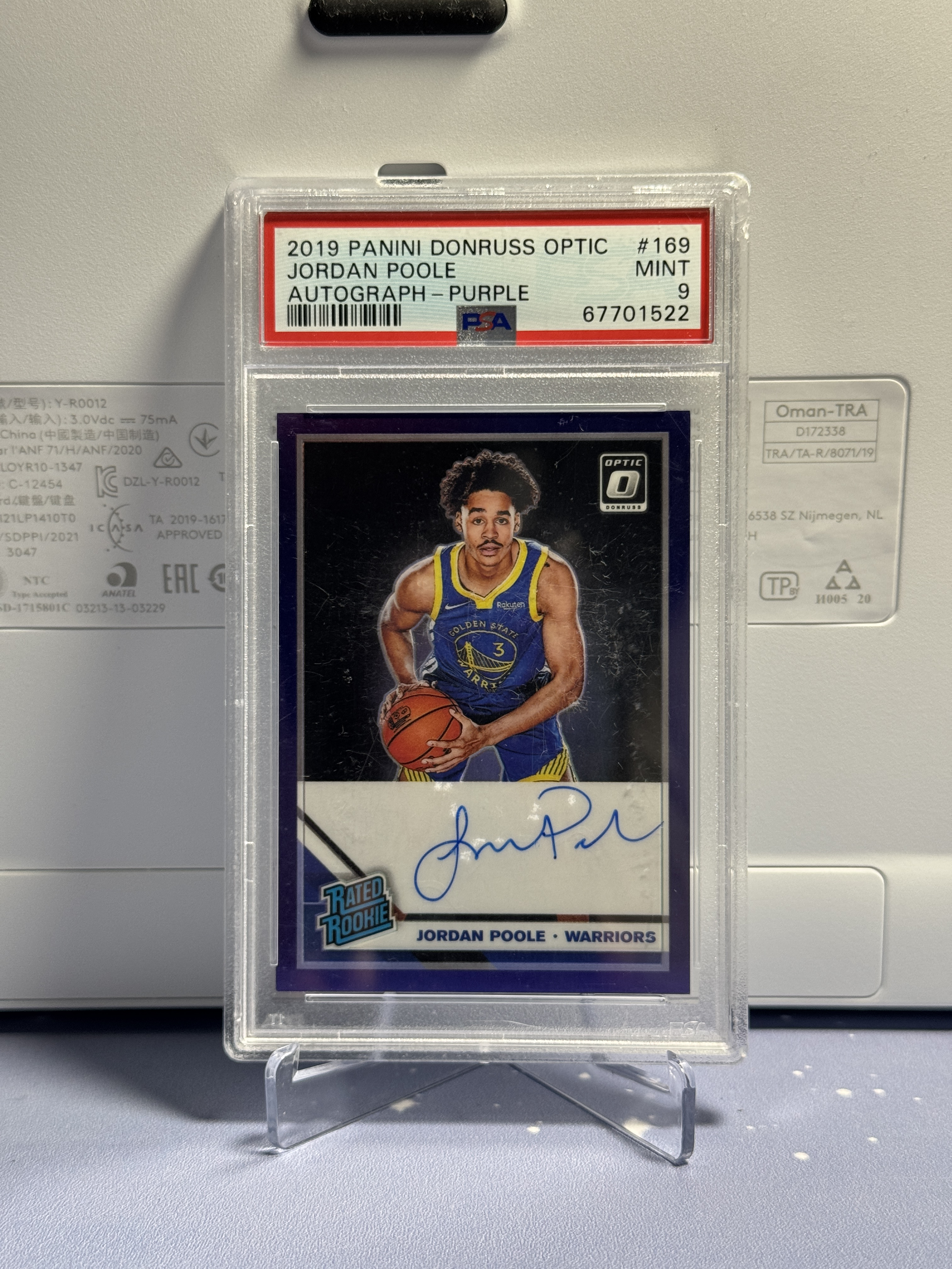 2019-20 Panini Donruss Jordan Poole RC 乔丹 普尔 新秀 RC 签字 卡签 RA 紫折 折射 杜蕾斯 OP 勇士 篮球 评级卡 PSA9分
