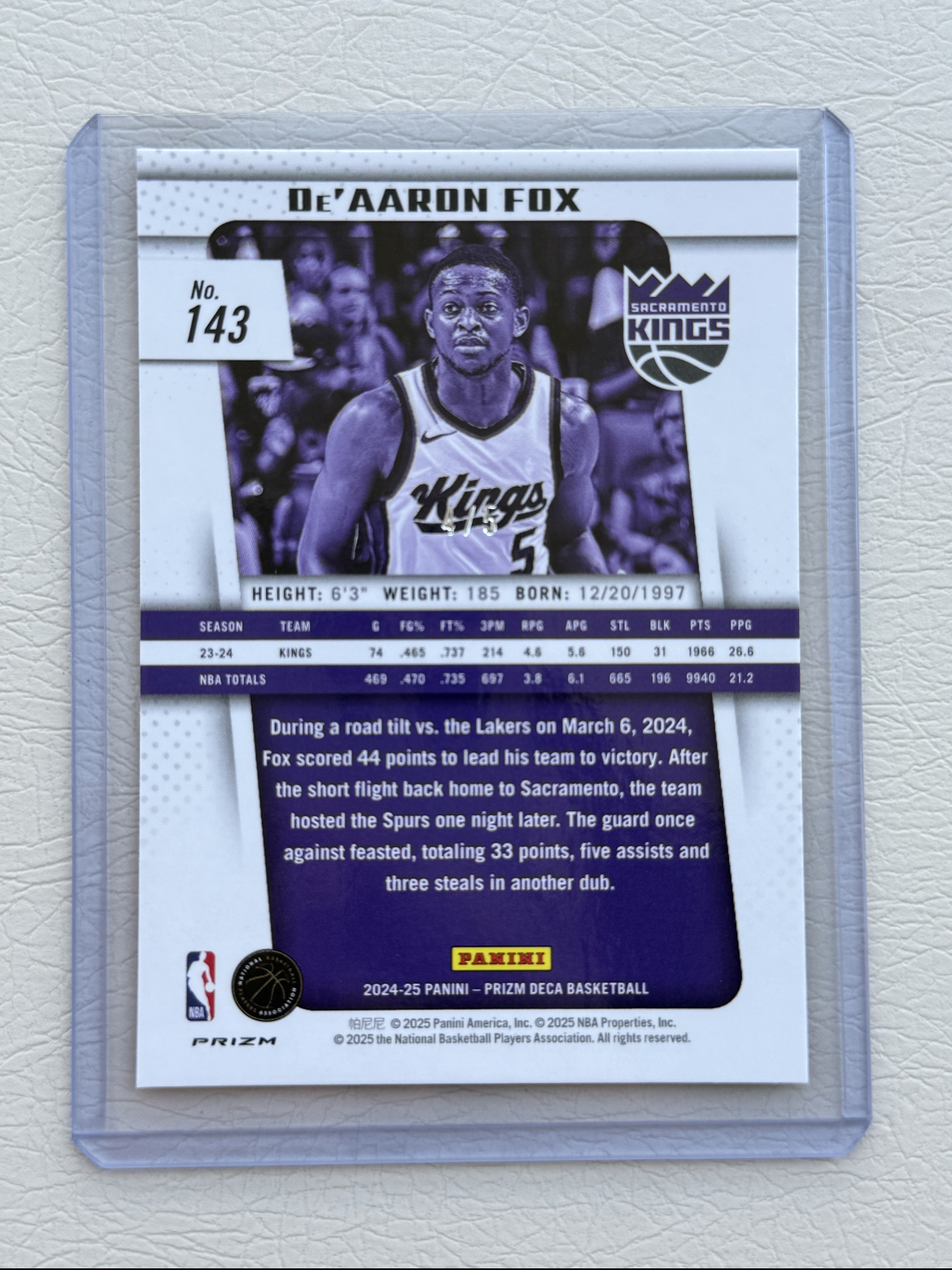 2024-25 Panini Prizm De'Aaron Fox pz Deca 元年复刻 国王 小狐狸 达隆 达龙 福克斯 正黑金折 折射 4/5编 背号编 品相如图